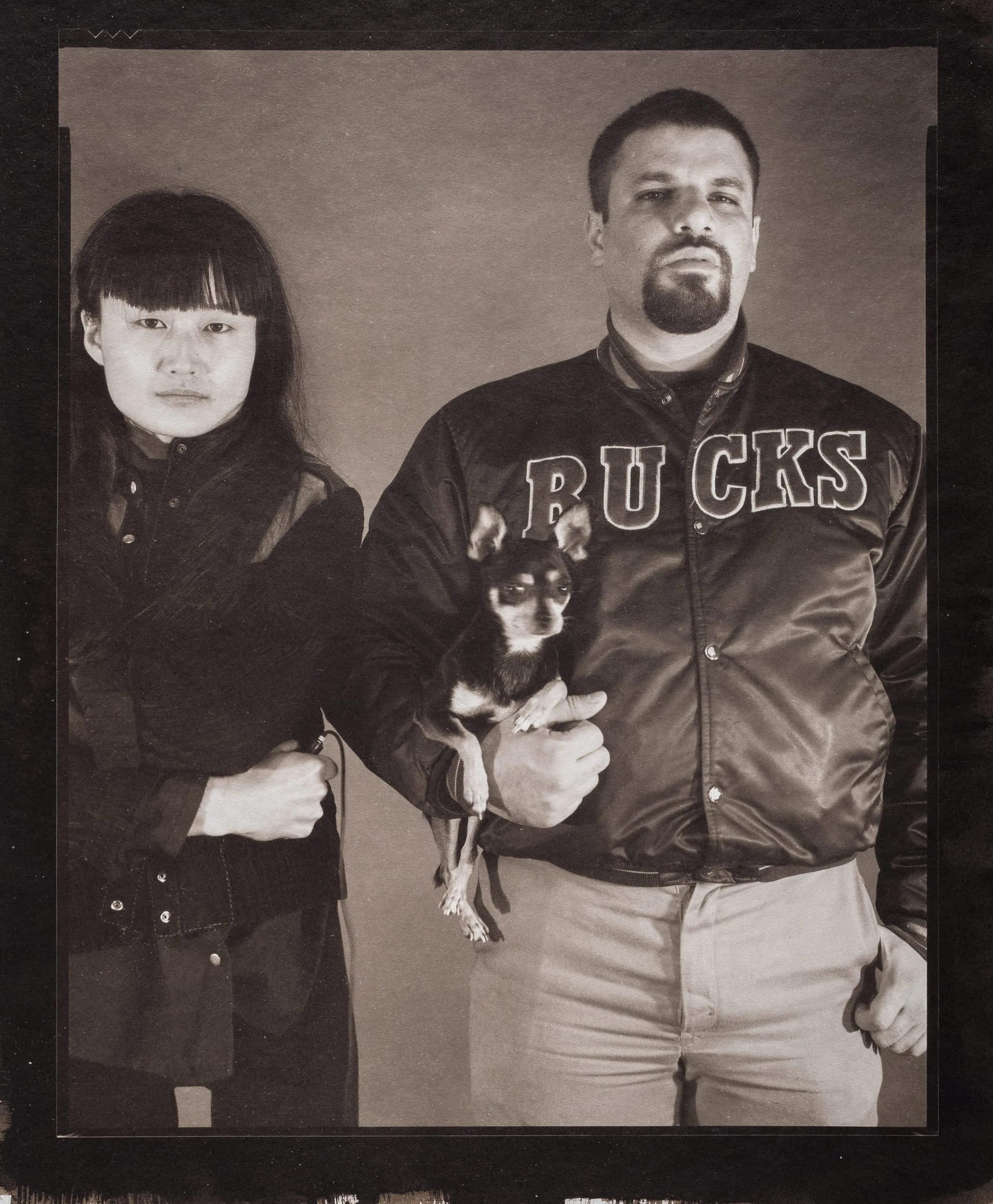 Black and white large-format studio photograph, a young Asian girl and a heavyset white man in a 'BUCKS' varsity jacket holding a small Chihuahua, both facing the camera