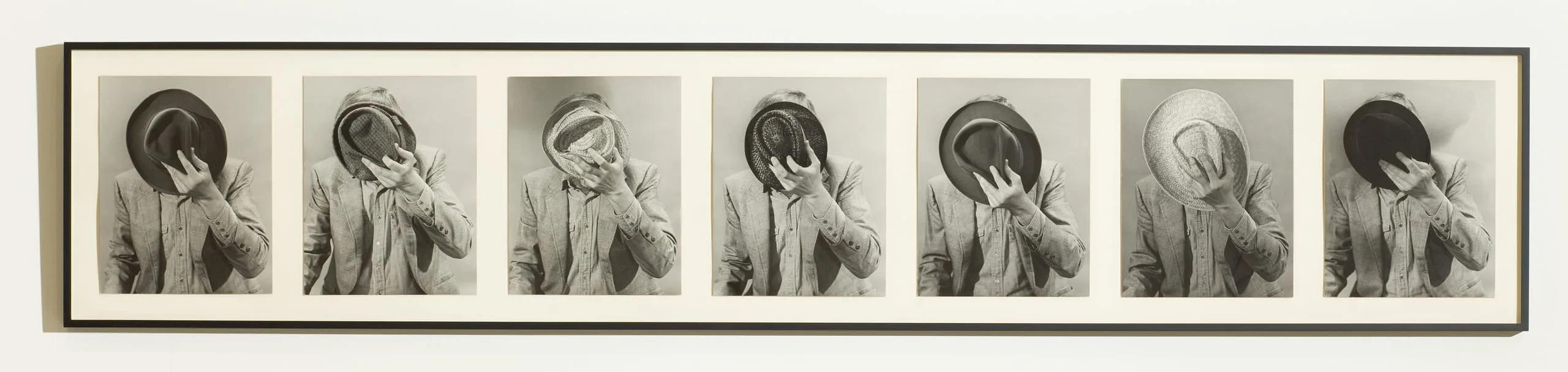 In Portrait: Artist's Identity Hidden with Various Hats, the artist not only questions the conventional aim of portraiture to portray a particular individual (by, in his characteristically playful way, shielding his face not once but seven times), but also initiates a formal strategy of concealment (or selective revealing) that Baldessari has continued to employ throughout his career (most famously with his signature colored "dots" employed to block out people's faces and thus their identities in found imagery). Portrait also speaks directly to Baldessari's lifelong interest in film, and especially the films of Buster Keaton - most notably the famous hat-choosing sequence in Keaton's Steamboat Bill, Jr.