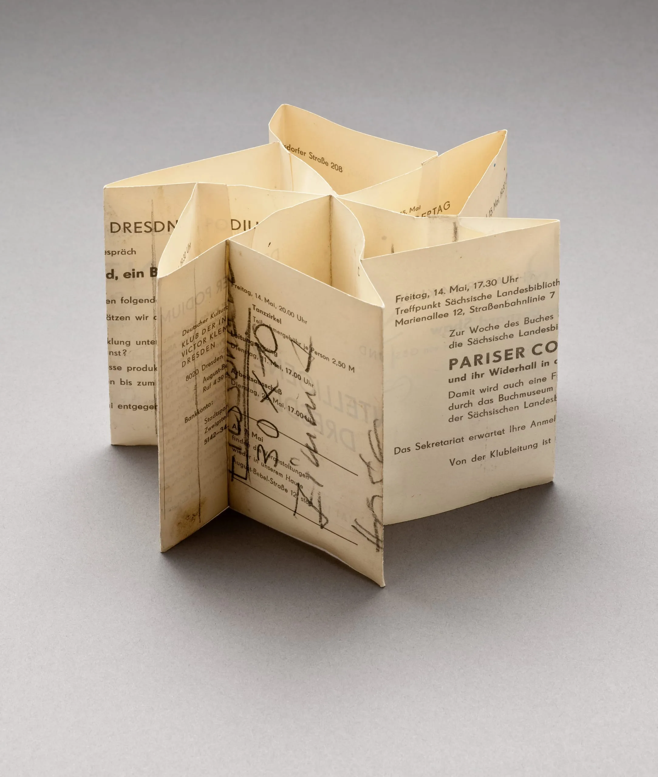 Three-Dimensionally Folded Star-Shaped Form is one of his miniature sculptures called modelli (“models”), for which Glöckner manipulated materials from his household to create unique, intimate objects that he kept private, rarely exhibiting them during his lifetime. In Three-Dimensionally Folded Star-Shaped Form , the monthly program of a “club of intelligence” (an officially sanctioned, interdisciplinary society for artists and intellectuals in East Germany) is folded into a star-shape: here, the lofty questions and topics on the program contrast with the handwritten list, partially obscured by the folds. Words like “cinnamon,” “shoes,” “bunch of flowers,” “stockings,” and “woodturner” proliferate across the sides of the star, suggesting that the role envisioned for artists in a socialist utopia cannot be easily reconciled with the daily realities of East German life.