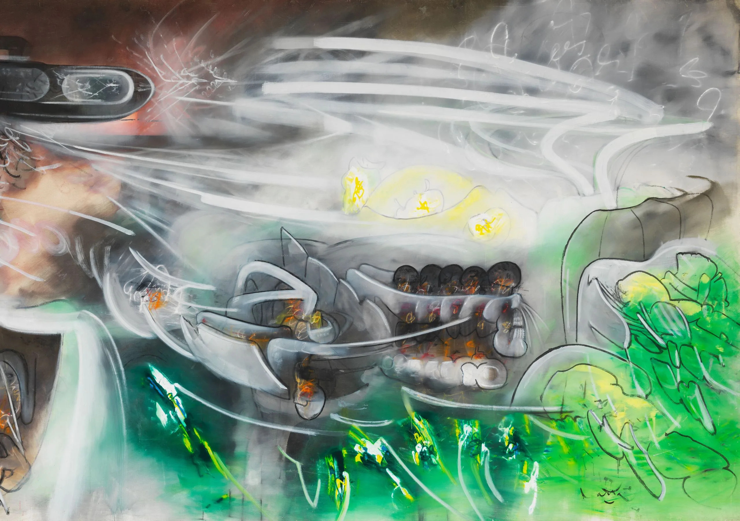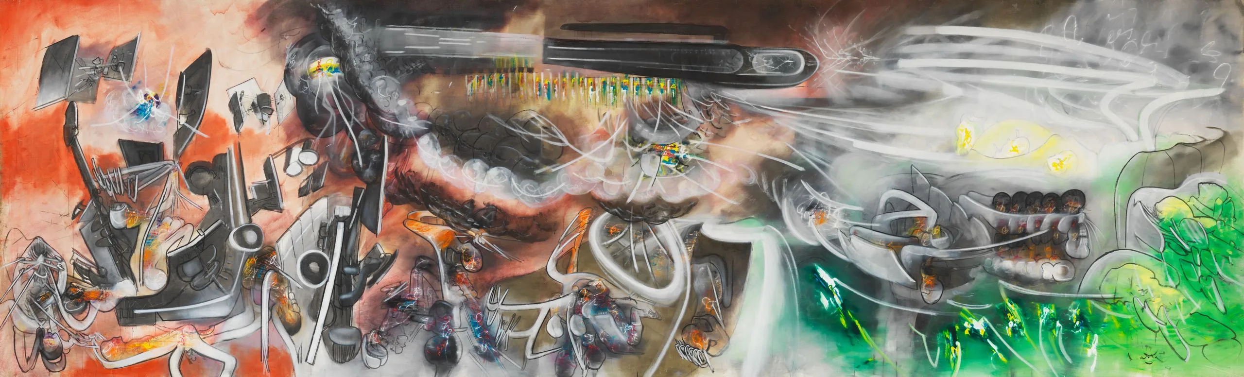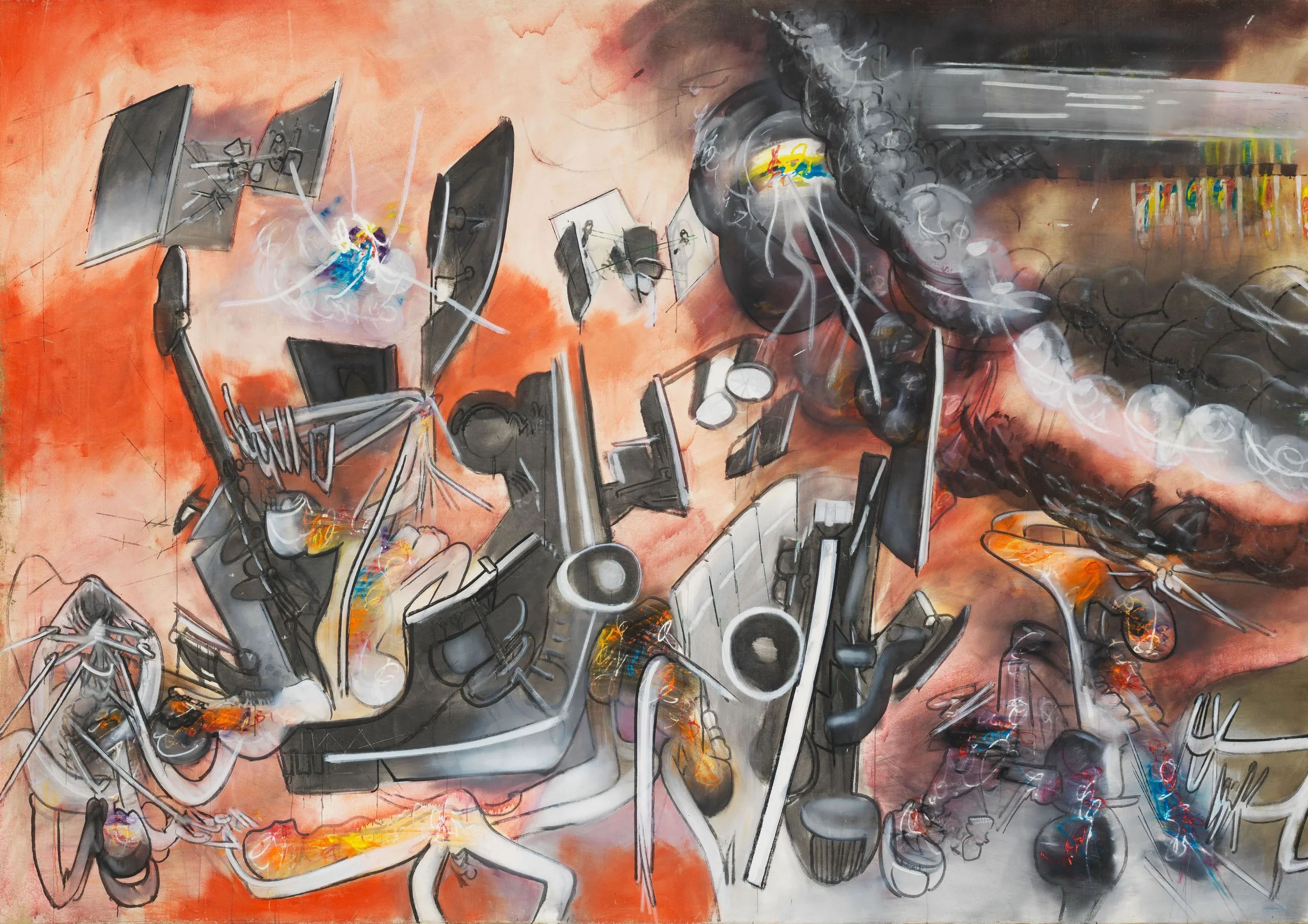In Burn, Baby, Burn the viewer's eye moves incessantly from one point to another, echoing the bold dynamic and rhythmic sense of this quasi-galactic, futuristic composition. There is an electric, almost cinematic quality to the picture. Through a powerful turbo-like shorthand, Matta conveys a sense of speed and dislocation. Signs are scattered throughout the surface: imploding satellites to the left, suggesting the velocity with which news travels, a bolting vehicle at the top speeding across a freeway, and a group of black heads in a vertiginous vortex to the right. The phosphorescent, pungent green at the bottom right of the composition suggests hope, a verdant future. Like Picasso's Guernica (1937)-a work that Matta greatly admired and which he helped install in the Paris 1937 Universal Exposition-Burn, Baby, Burn is a bold indictment of the destructiveness of mankind and a manifesto for peace.
