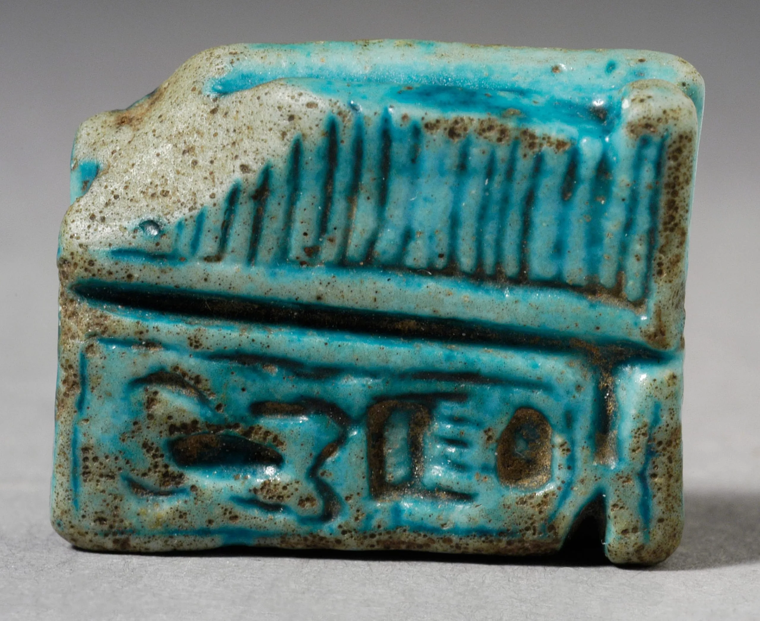 Small ancient Egyptian faience plaque with turquoise glaze, carved with vertical ridges above a row of hieroglyphic symbols in low relief