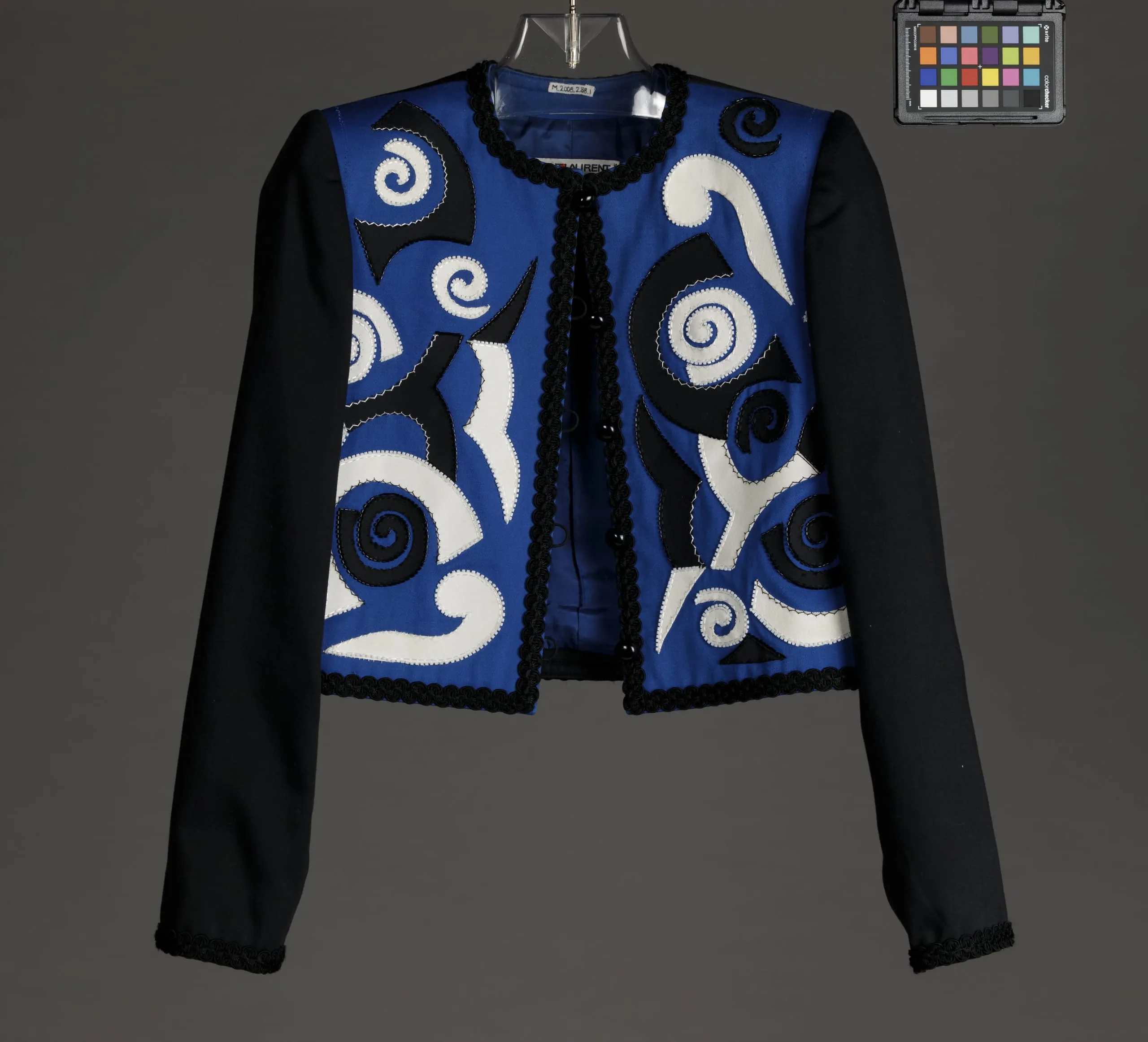 - Cotton twill, with cotton twill appliques, glass beads, silk embroidery, silk passementerie, and plastic buttons