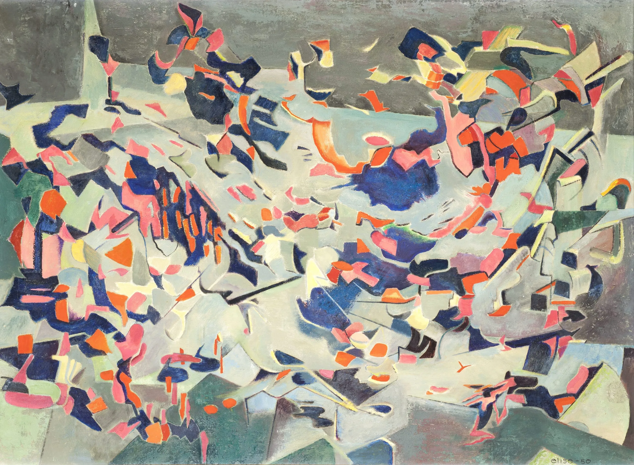 Horizontal abstract painting with hundreds of scattered angular and organic shapes in coral, navy, pink, yellow, and sage green against a pale gray-green ground