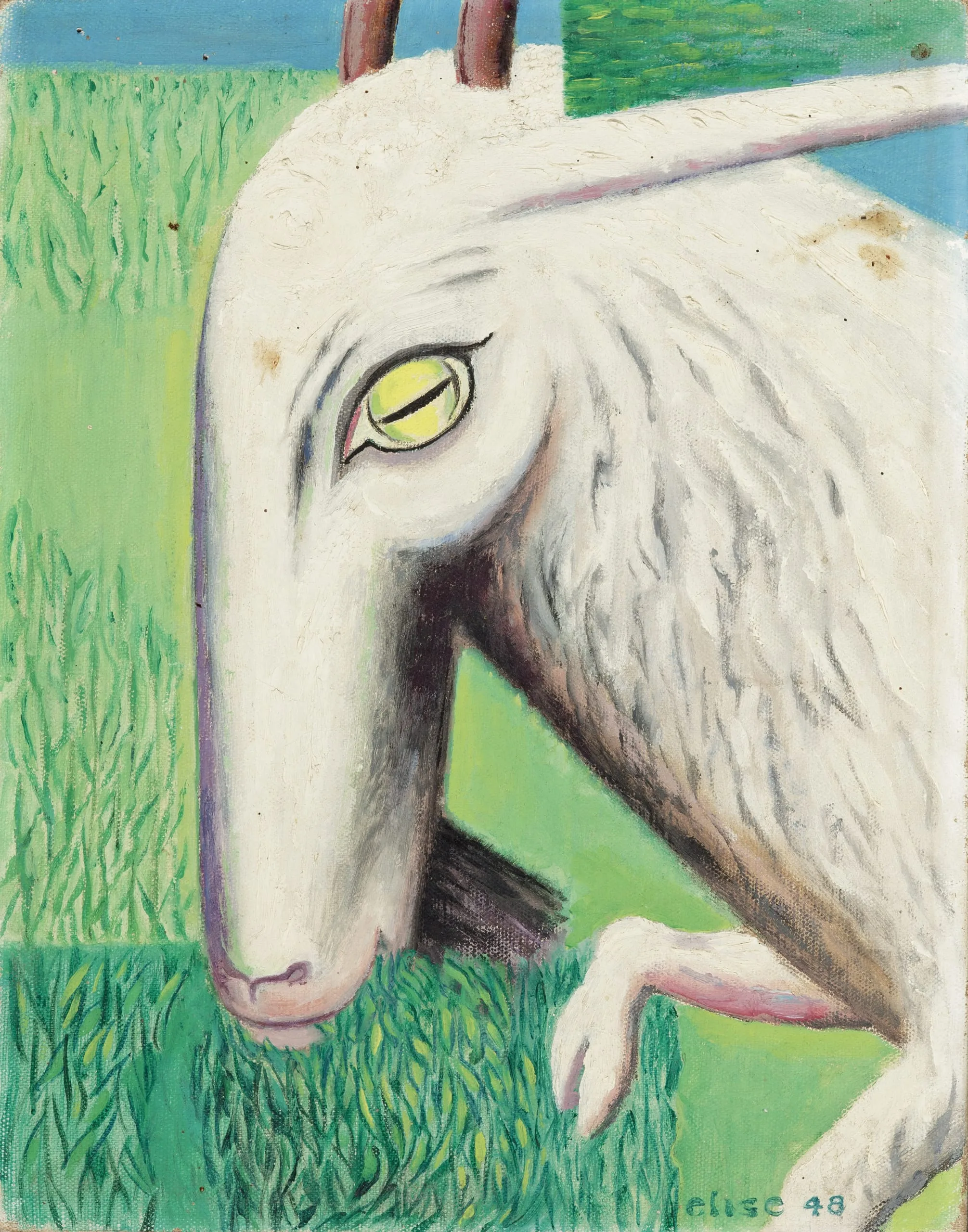 Oil painting of a white goat with a yellow slit-pupil eye, head bent toward bright green grass, painted in close-up with reddish-brown horn stubs cropped at the top edge, signed 'elise 48'