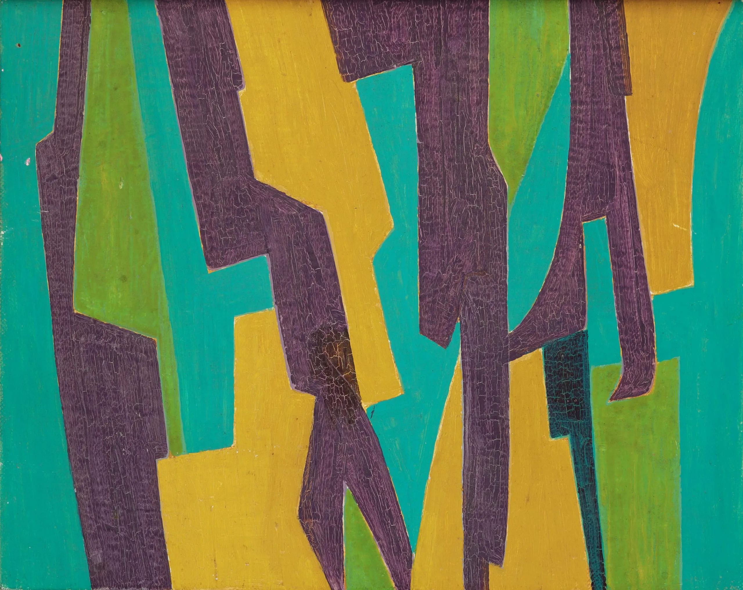 Abstract horizontal painting with angular, forked purple shapes over flat fields of marigold yellow, turquoise, and chartreuse green, with visible craquelure across the surface