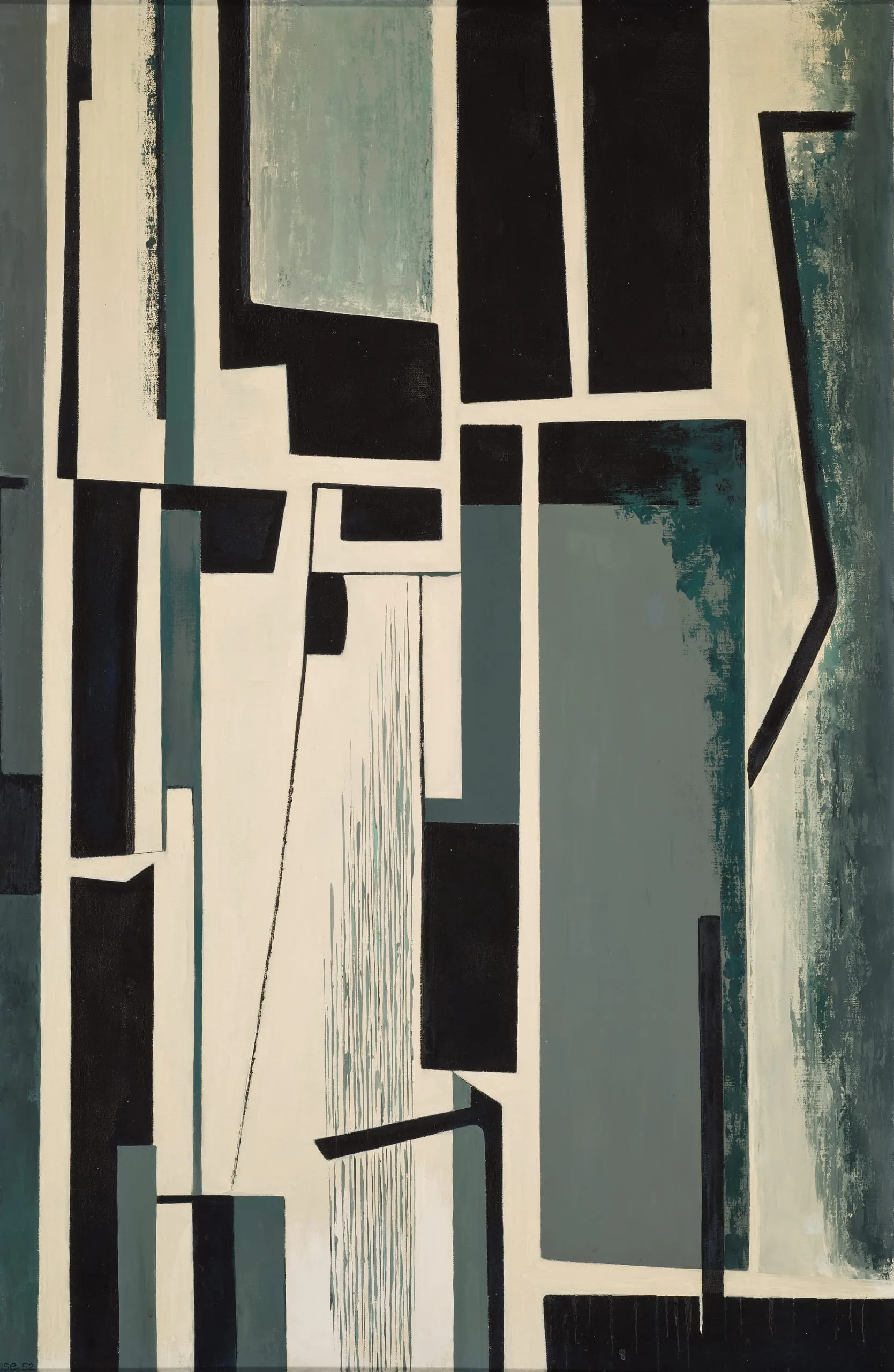 Vertical abstract painting with interlocking rectangles and angular forms in off-white, black, slate gray, and teal green, with a restrained palette and hard-edged geometric composition