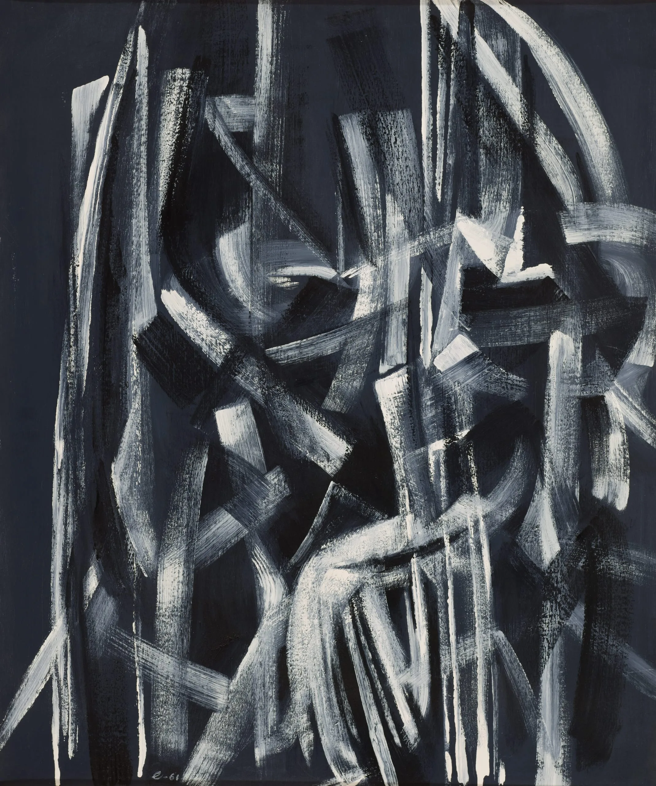 Vertical abstract painting with overlapping gestural brushstrokes in white and gray against a deep navy background