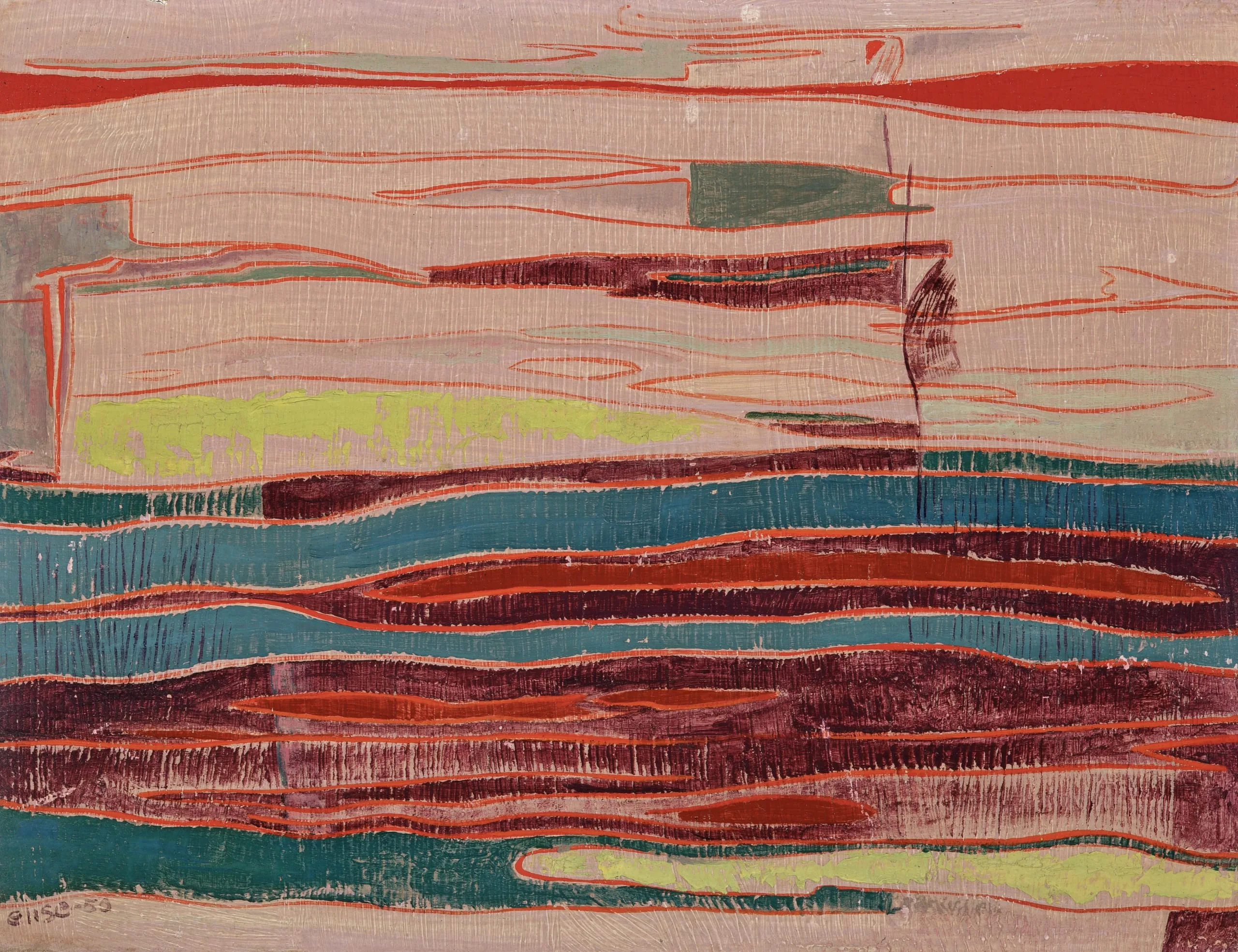 Horizontal abstract painting with layered bands of coral-red, teal, chartreuse, and dark maroon on a pale rose ground, with striated surface texture and wavy red contour lines throughout