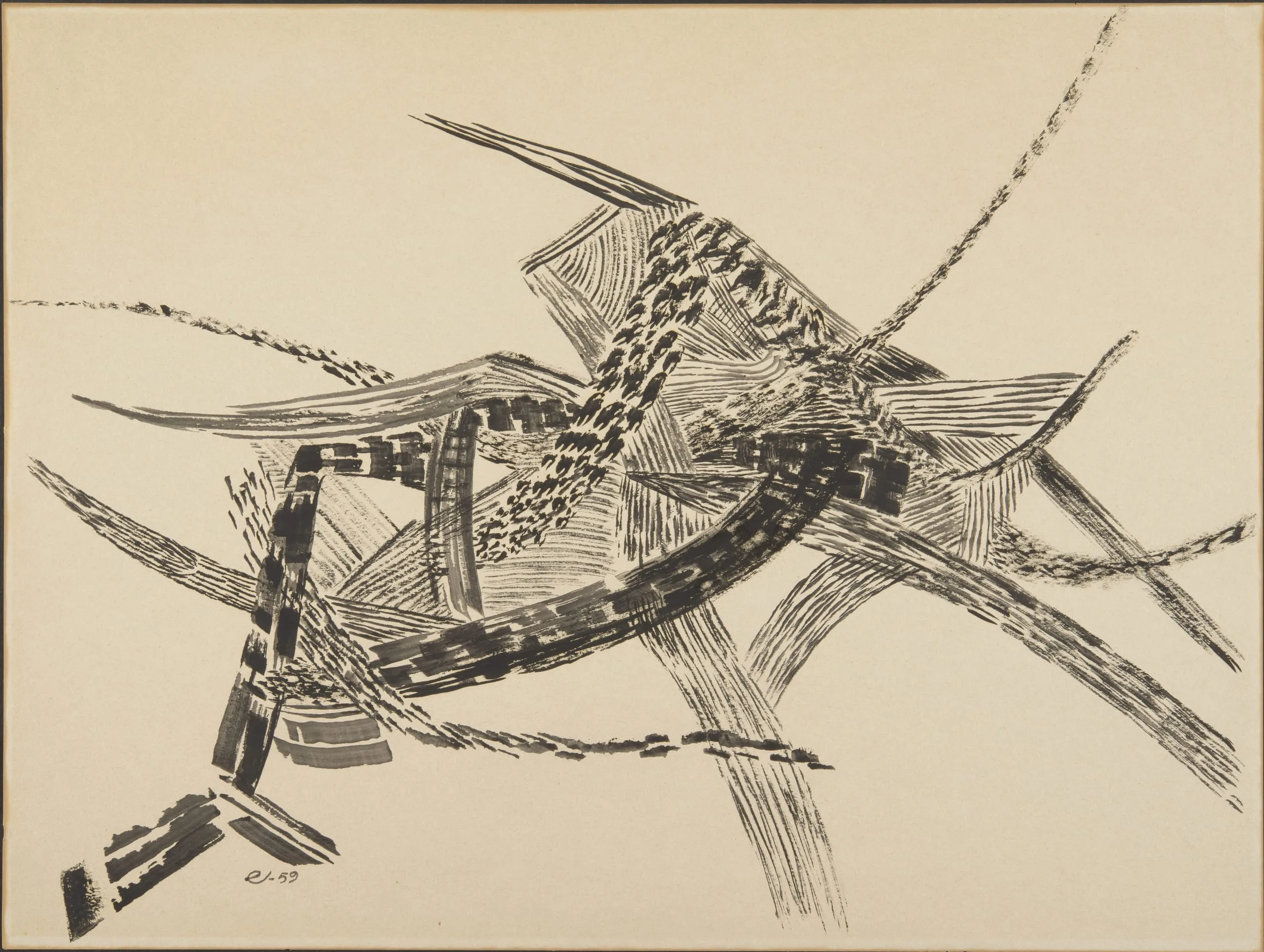 Abstract ink drawing on cream paper with dense hatching, sweeping arcs, and radiating blade-like strokes forming a central starburst cluster