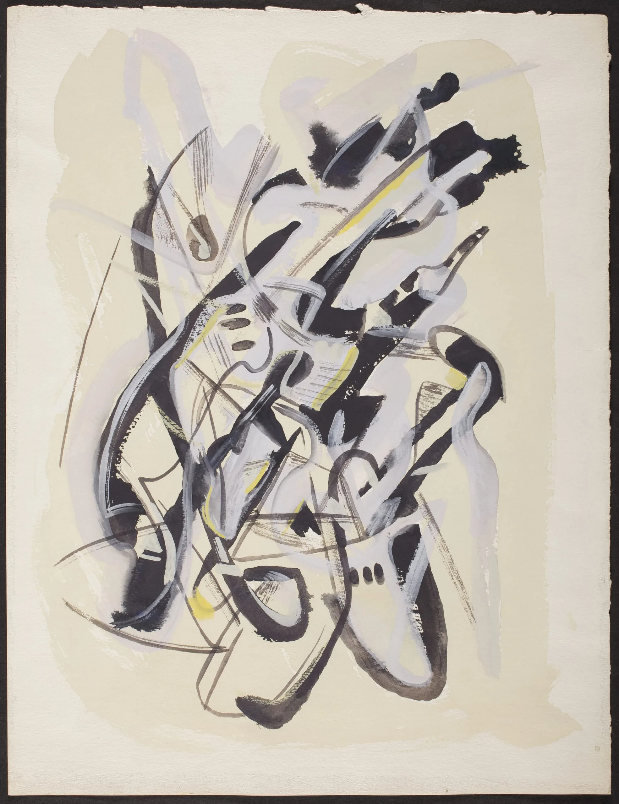 Vertical abstract work on cream paper with gestural black, gray, and white brush strokes in a dense central cluster, accented with small chartreuse yellow marks