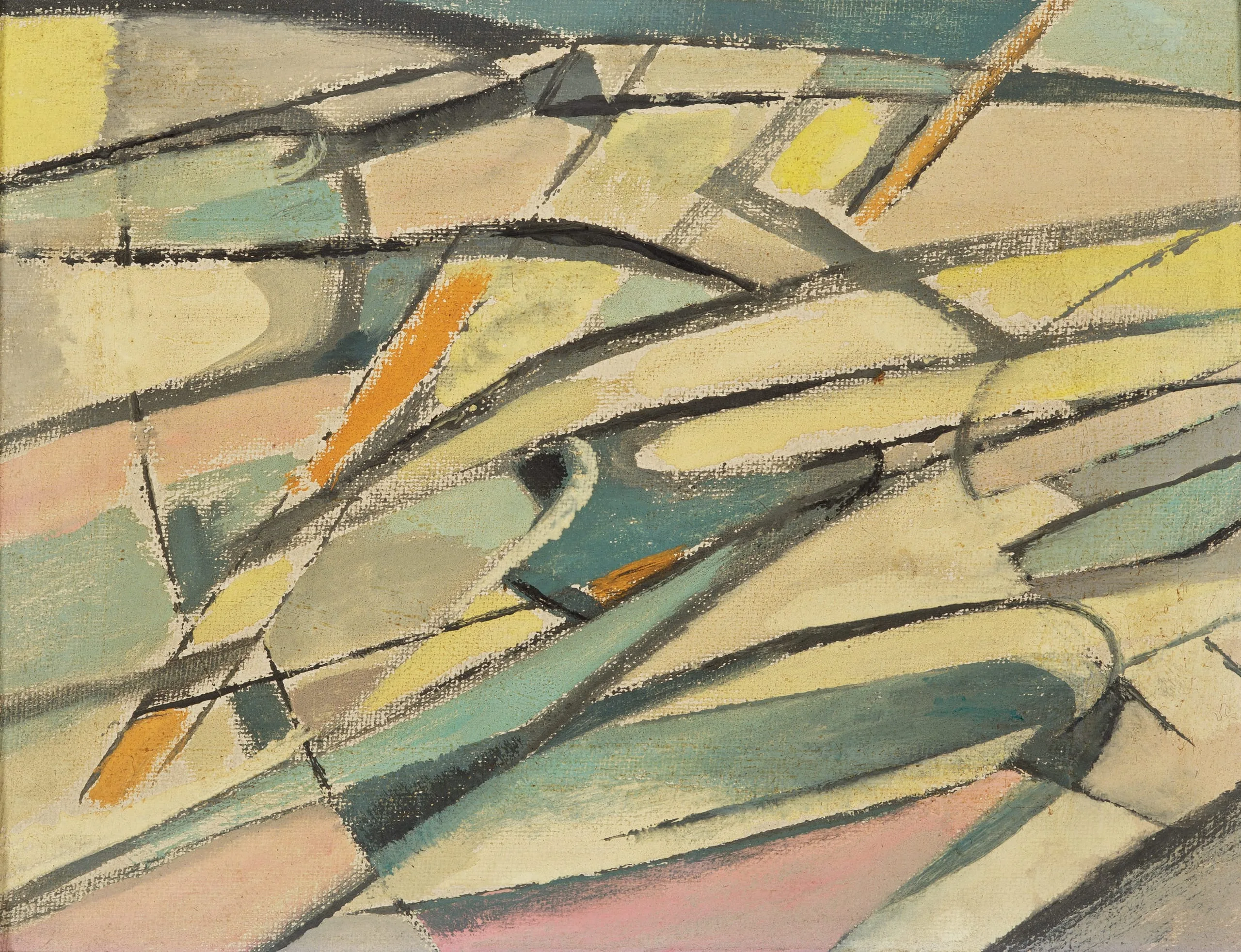 Horizontal abstract painting with overlapping curved and diagonal bands in cream, sage green, teal, and pale yellow, accented with tangerine orange strokes and defined by charcoal-black lines