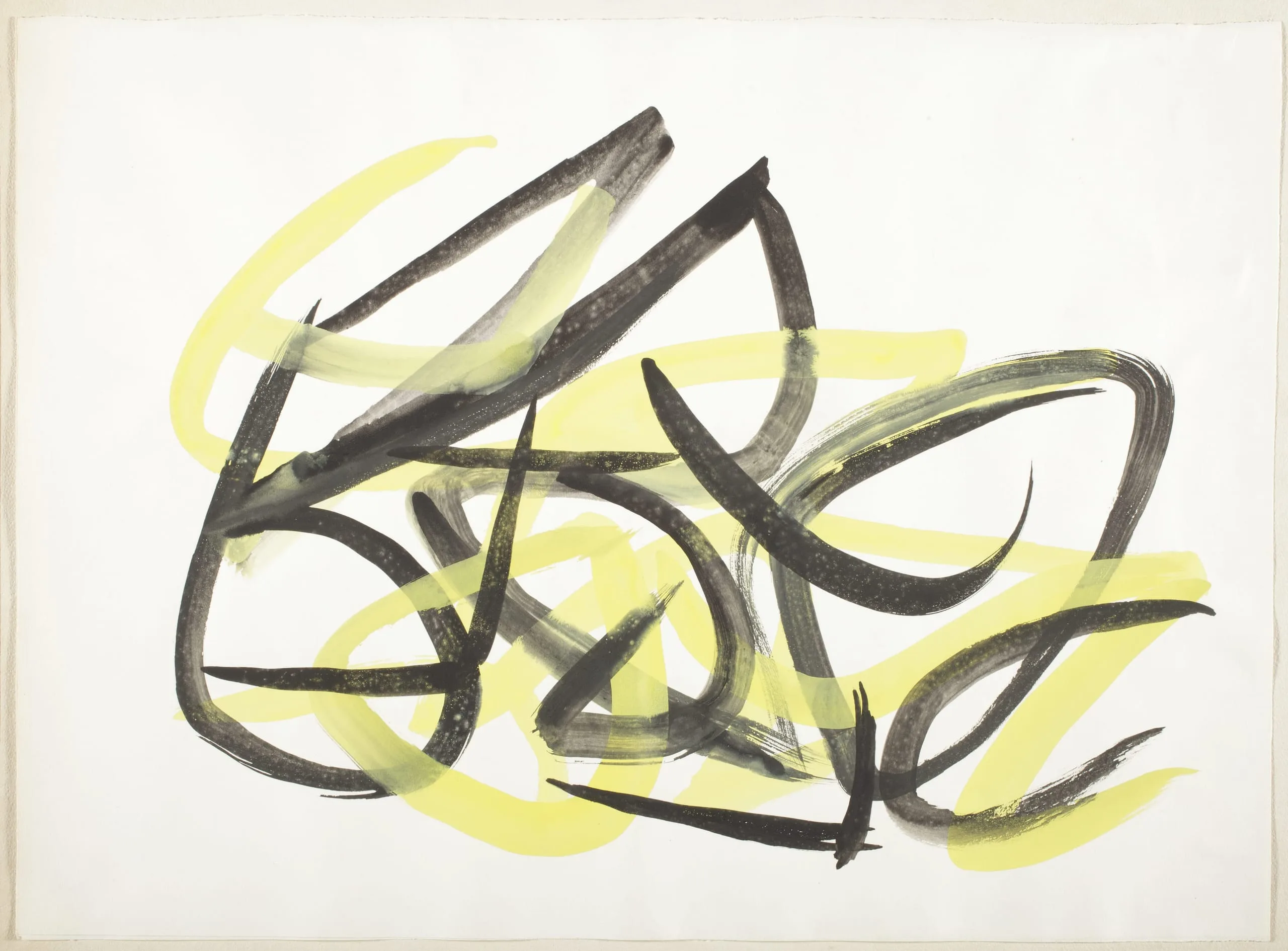 Horizontal abstract work with sweeping chartreuse yellow and near-black brushstrokes layered over an off-white surface, with looping curves and sharp diagonal marks
