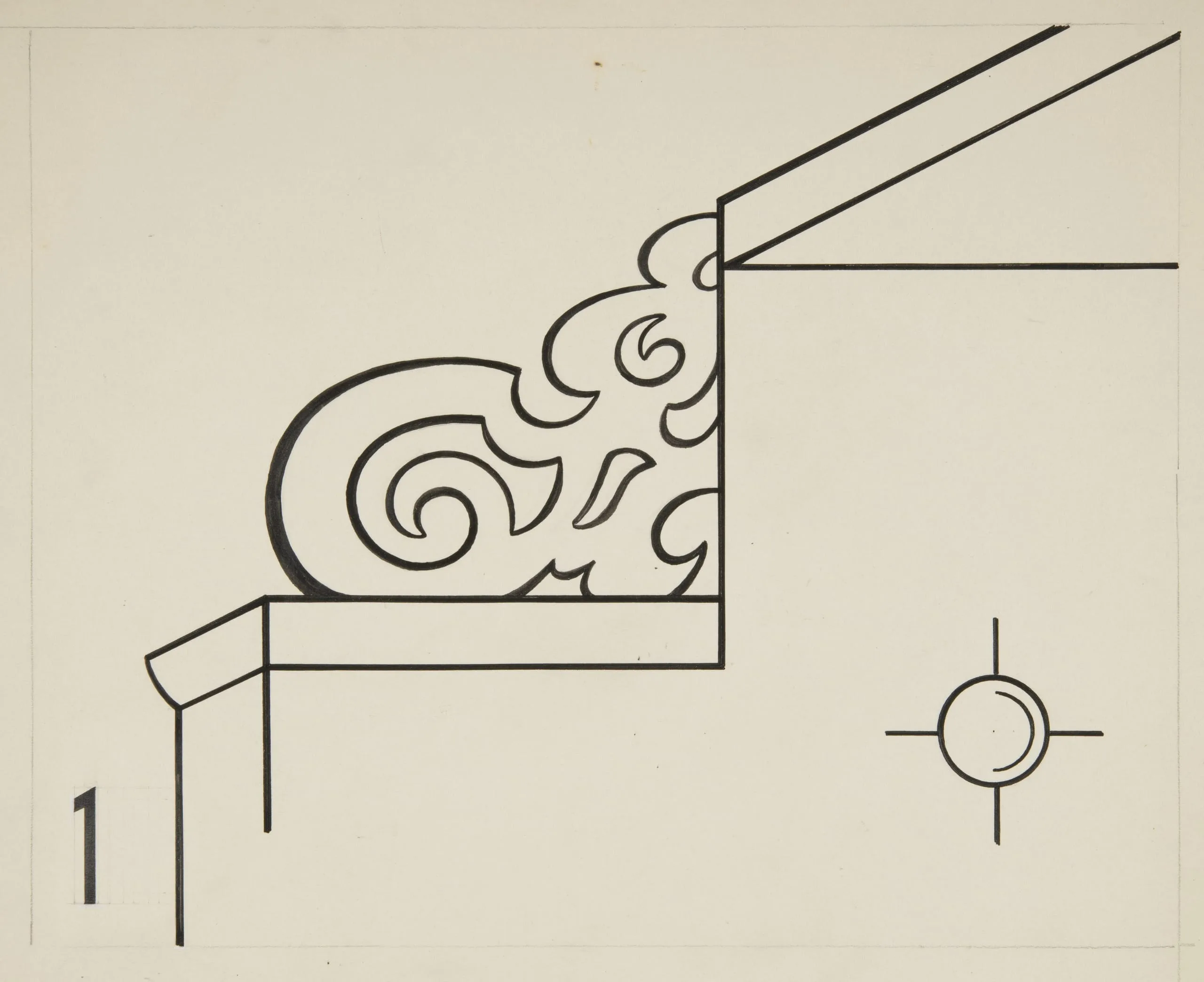 Architectural drawing in black ink on off-white paper showing a classical volute bracket with scrolling ornament, geometric cornice lines, a crosshair symbol, and the numeral 1