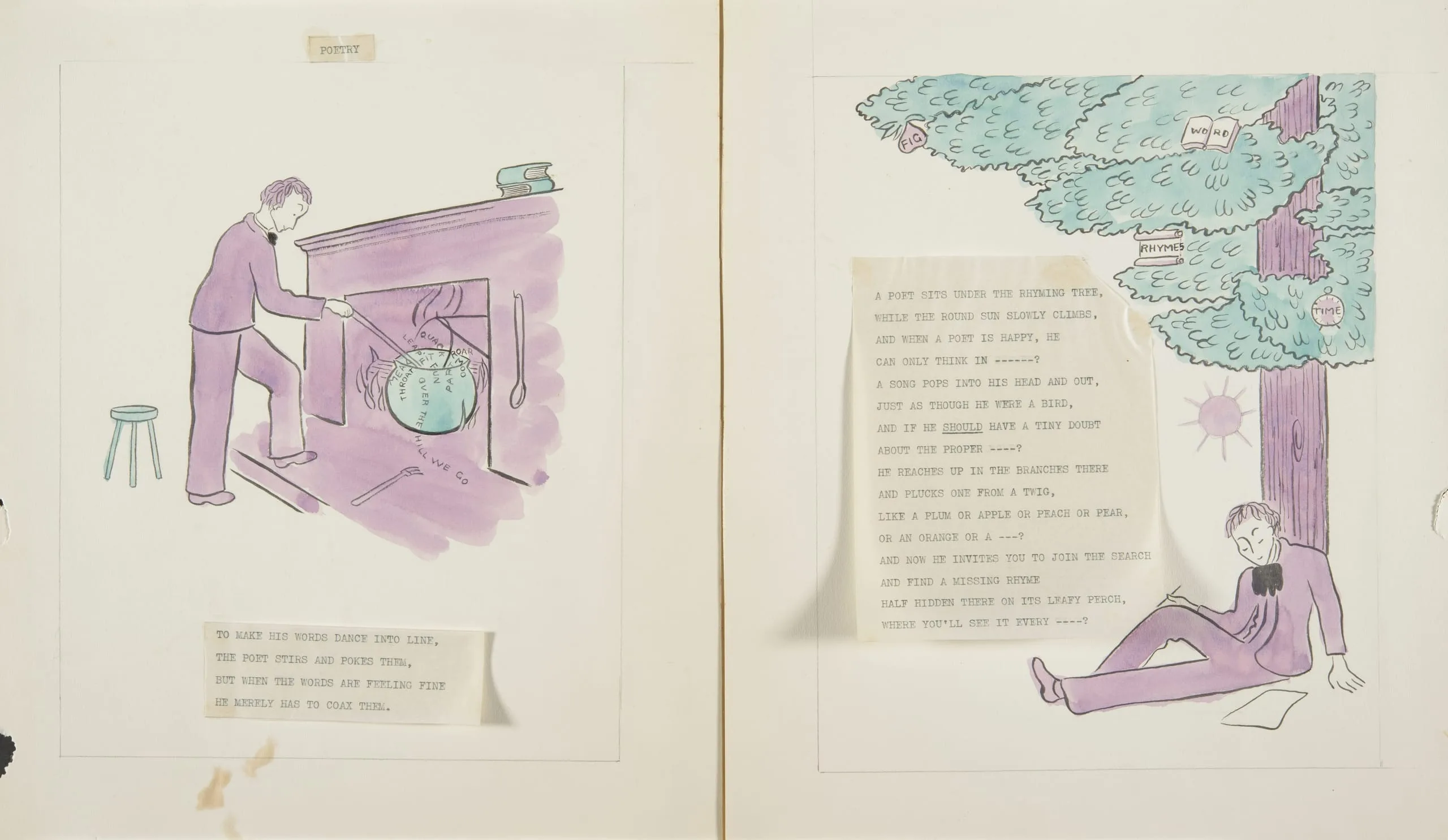 Ink and watercolor wash drawing on two facing book pages, showing a man stirring a pot over a fireplace on the left and a figure resting beneath a leafy tree on the right, with typewritten poem text on both pages