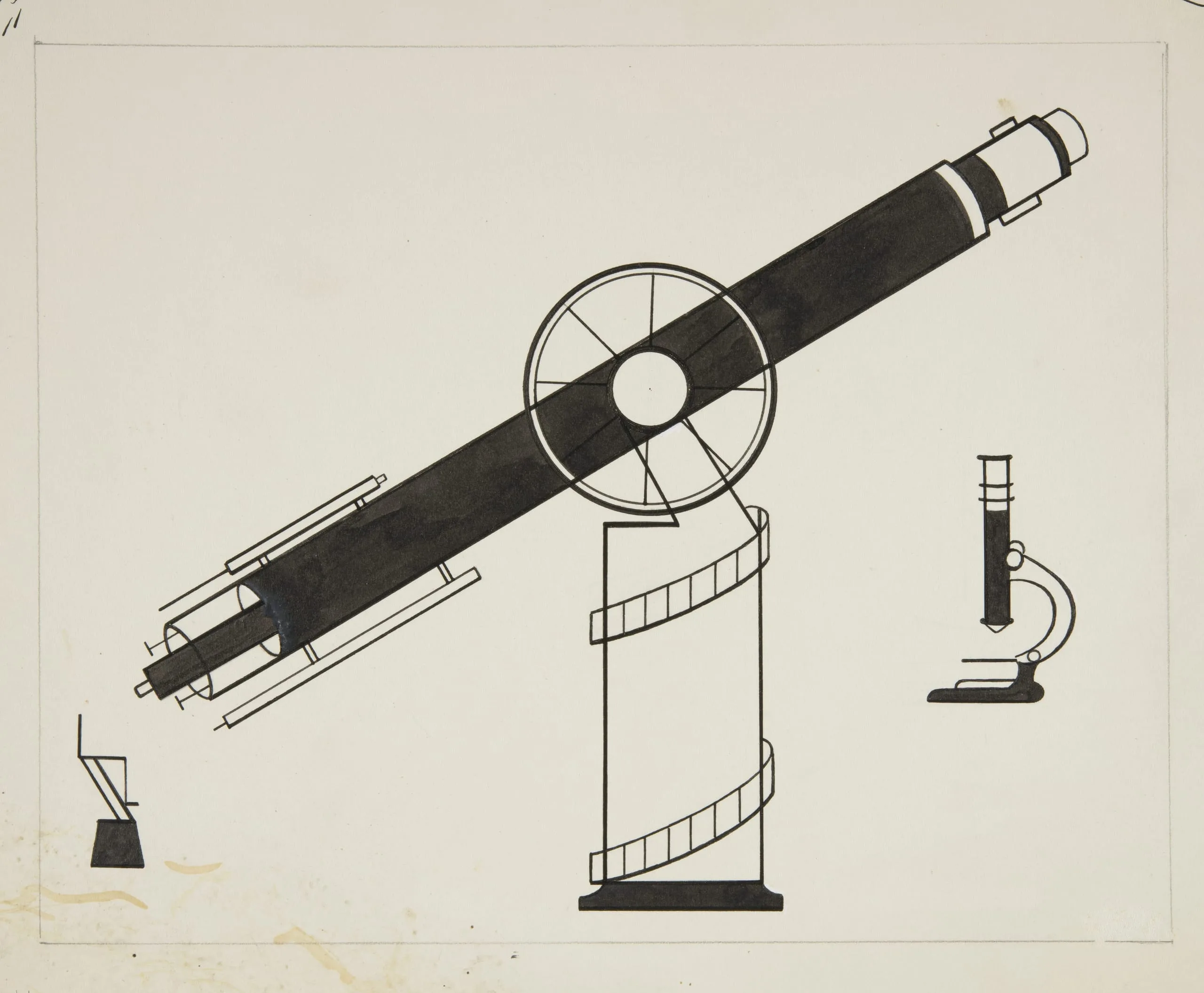 Ink and wash drawing on cream paper depicting a large diagonal telescope on a cylindrical mount, flanked by two smaller scientific instruments in a flat, graphic style