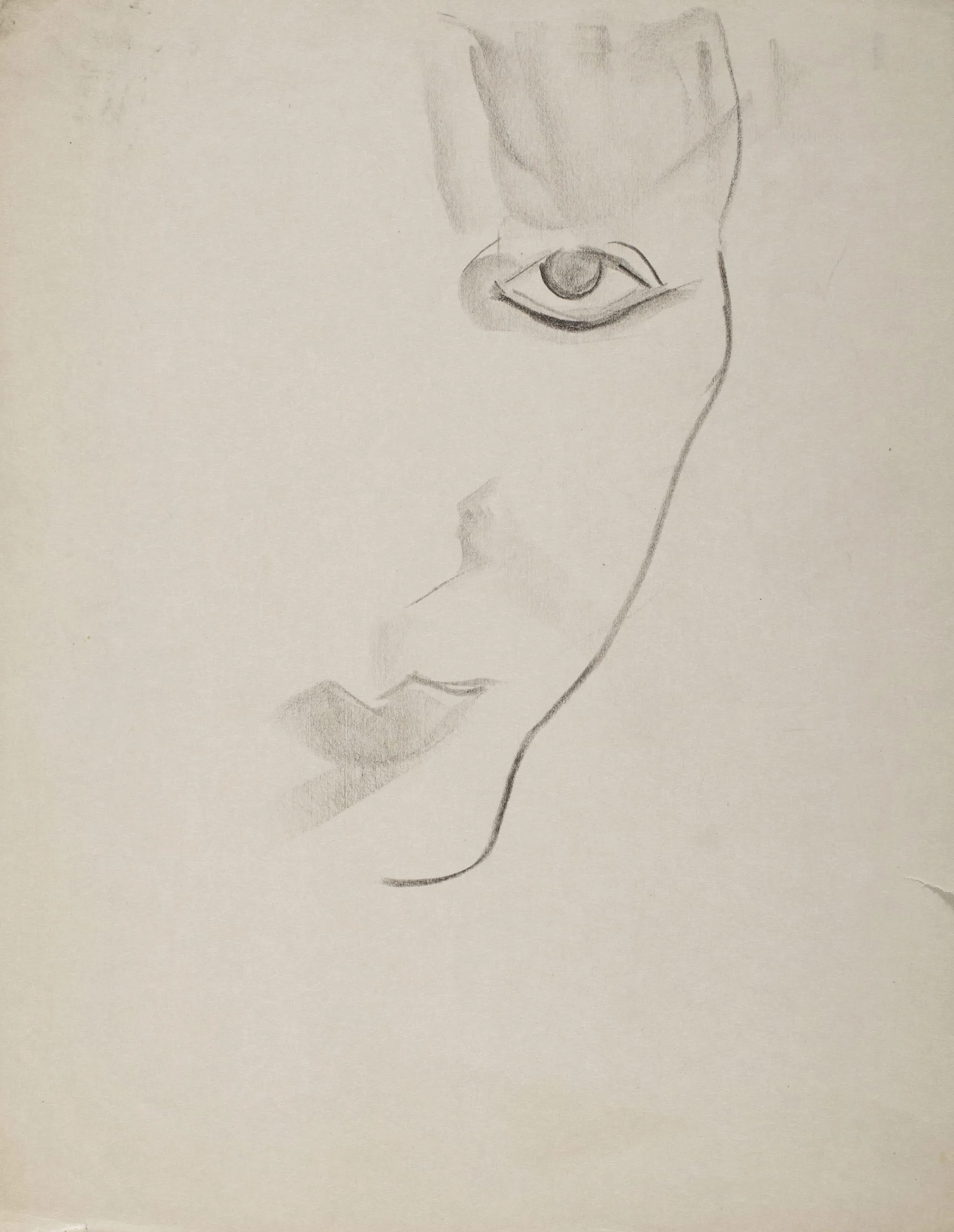 Graphite drawing on off-white paper, close-up study of a face in three-quarter view, with a single finished eye and loosely shaded facial planes
