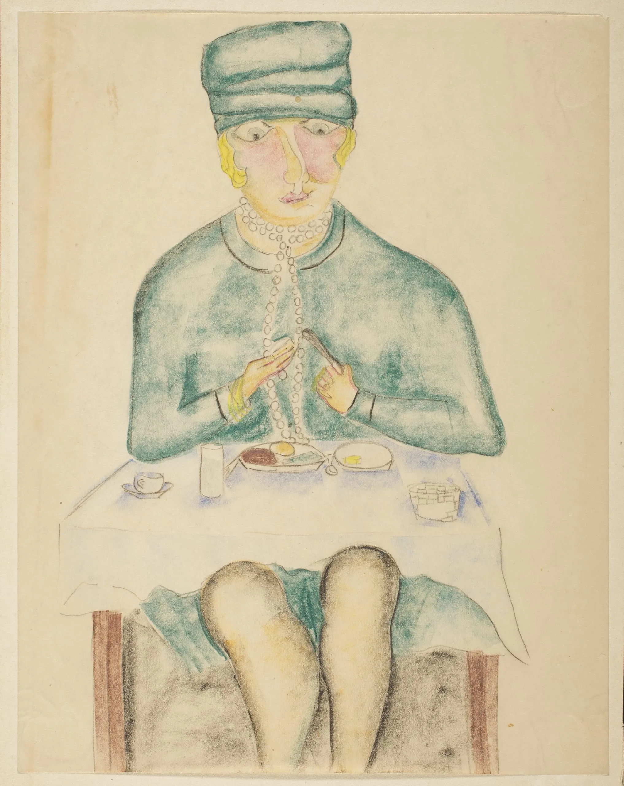 Colored pencil drawing of a seated woman in a teal dress and cap, holding her hands to her chest over a long bead necklace, at a set dining table