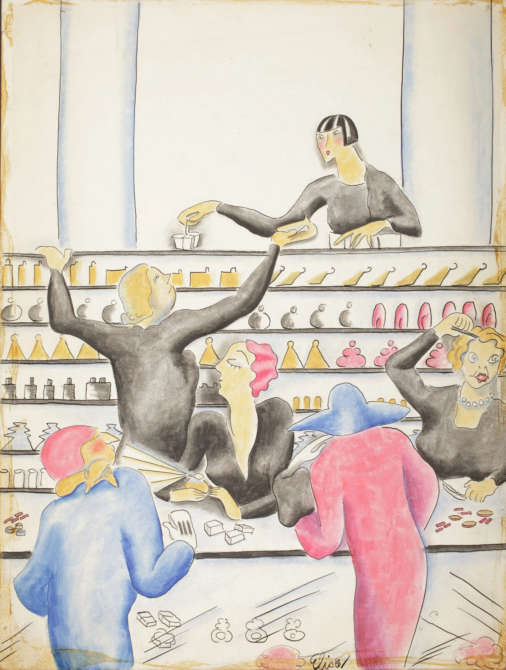 Watercolor and ink drawing of a cosmetics counter scene, with a saleswoman behind shelves of bottles and four customers crowding the counter, rendered in flat gray, pink, and blue washes with bold outlines