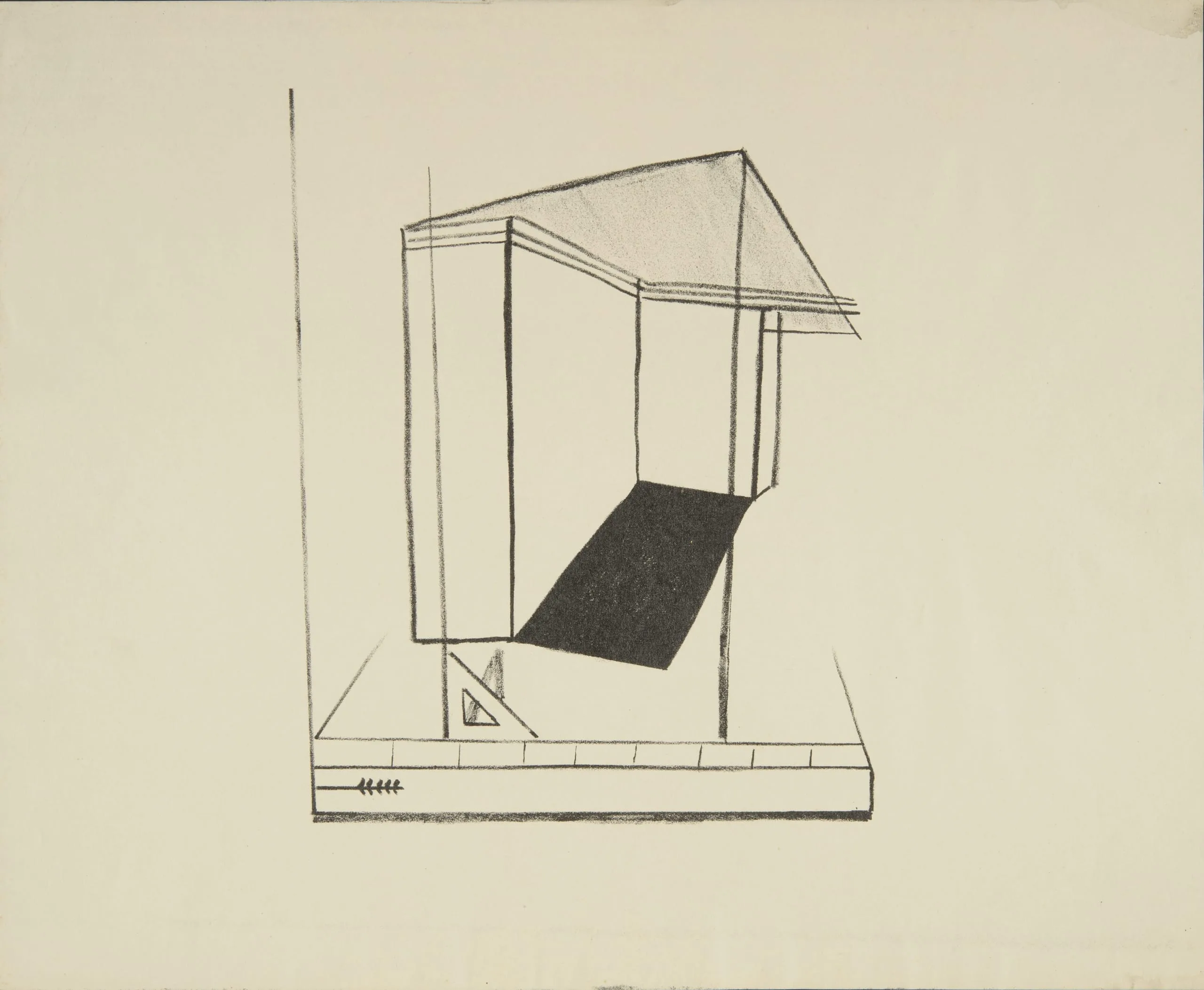 Graphite or charcoal drawing on cream paper of an abstract architectural shelter with a wedge-shaped roof and a solid black trapezoidal form inside