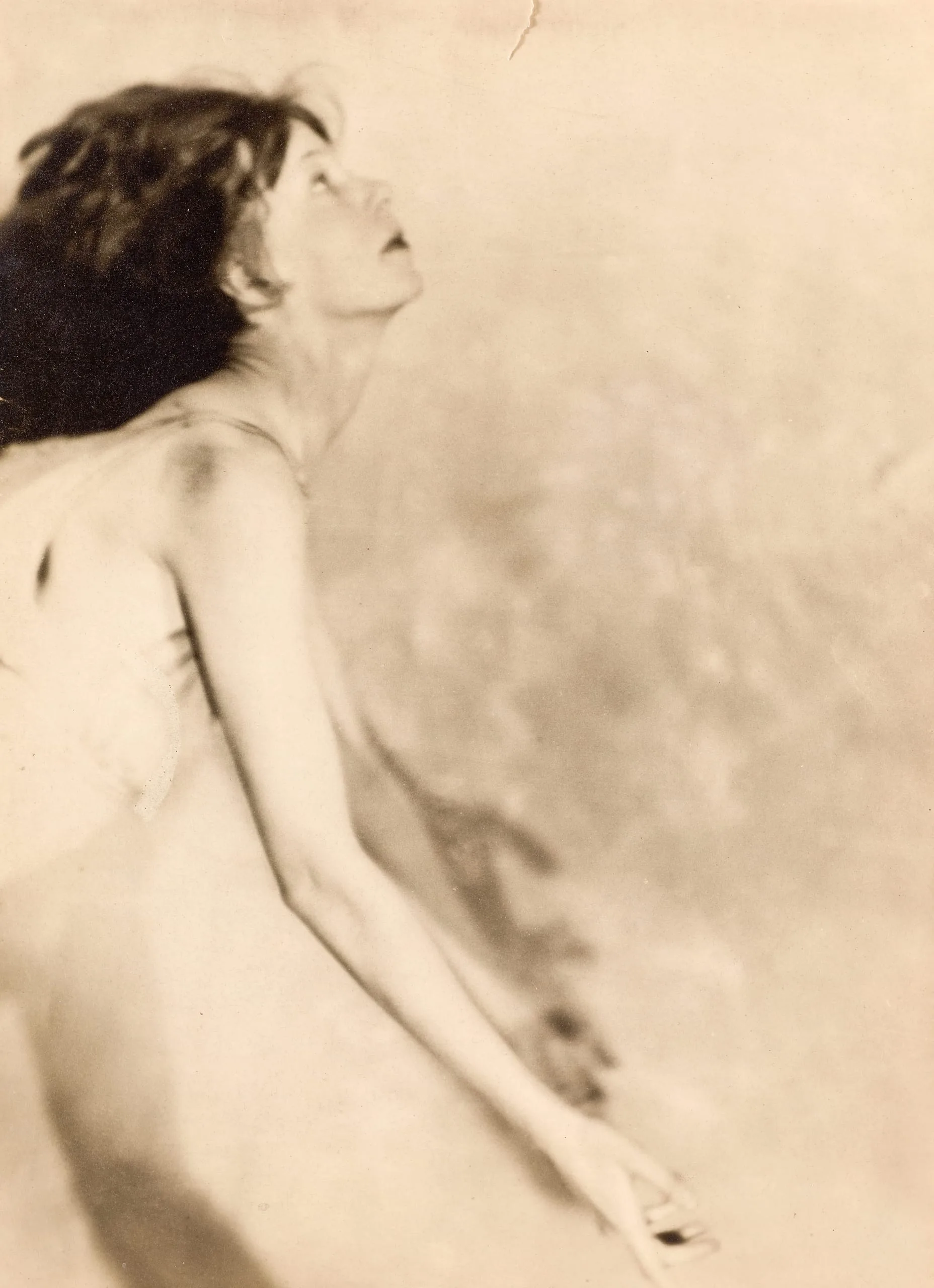 Sepia-toned photograph of a nude woman from the hips up, head tilted back in profile, soft focus with blurred background