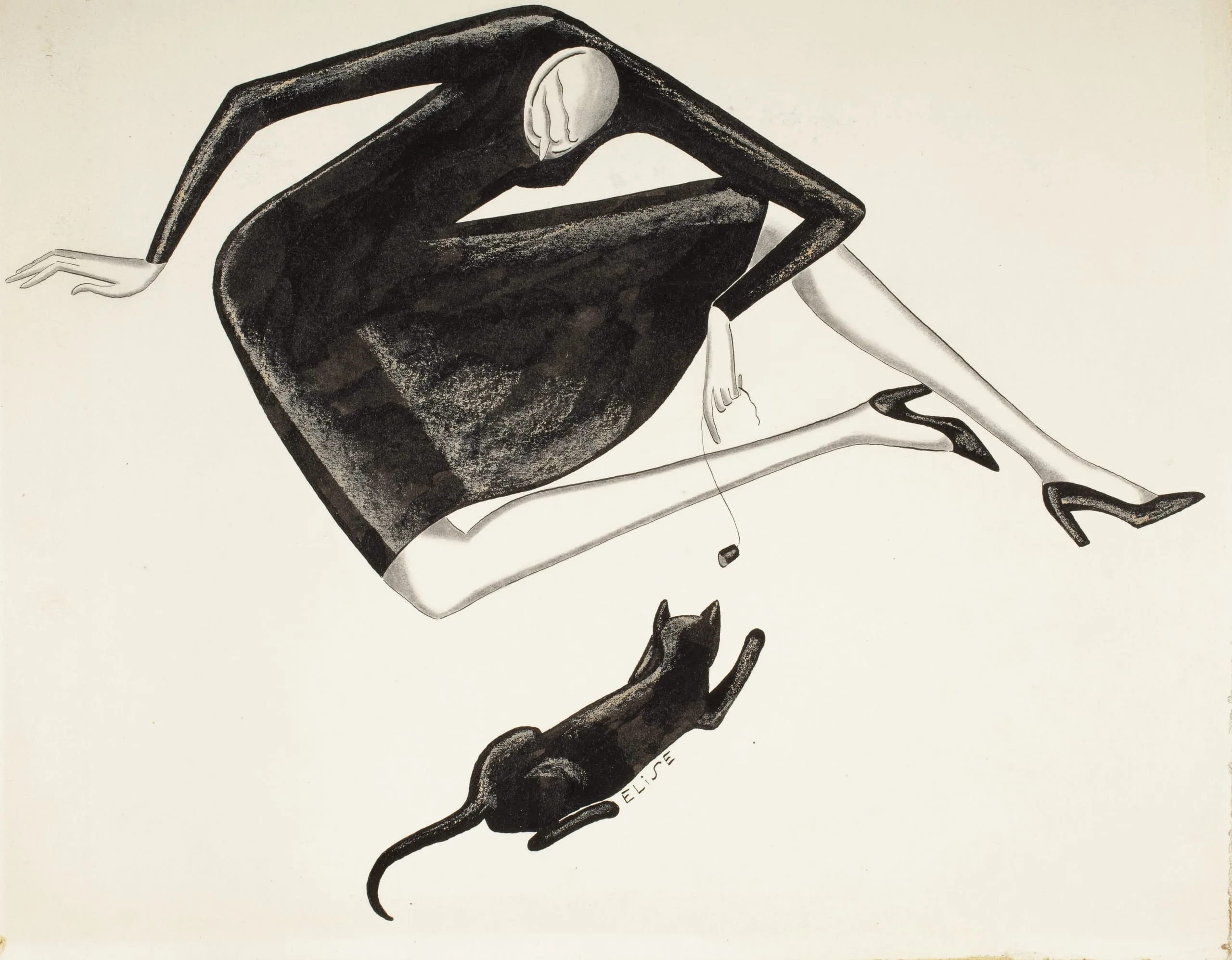 Ink and wash drawing of a stylized seated woman in a black dress and heels dangling a string toward a small black cat, on cream paper