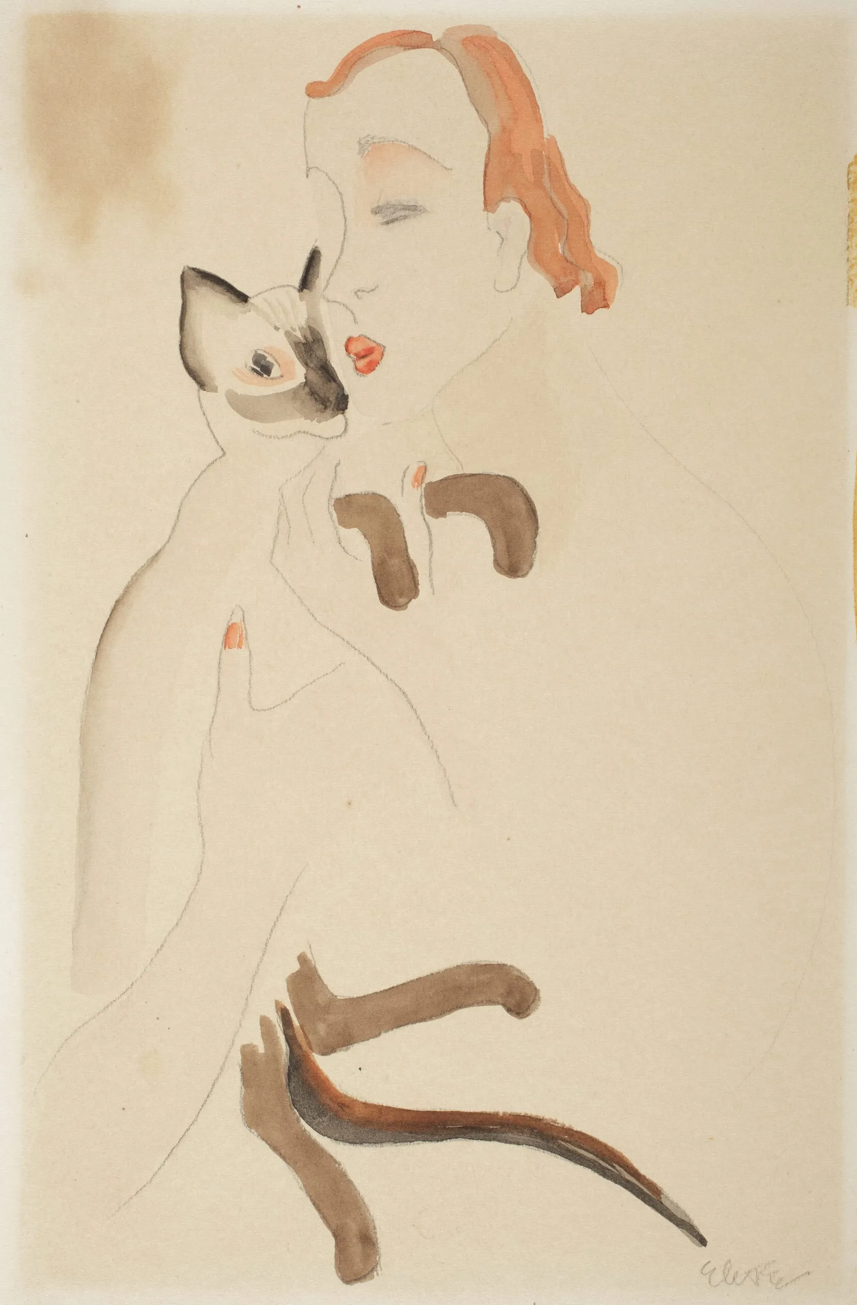 Pencil and watercolor drawing on cream paper, a woman with auburn hair holds a Siamese cat to her cheek, rendered in spare lines with loose brown and coral washes