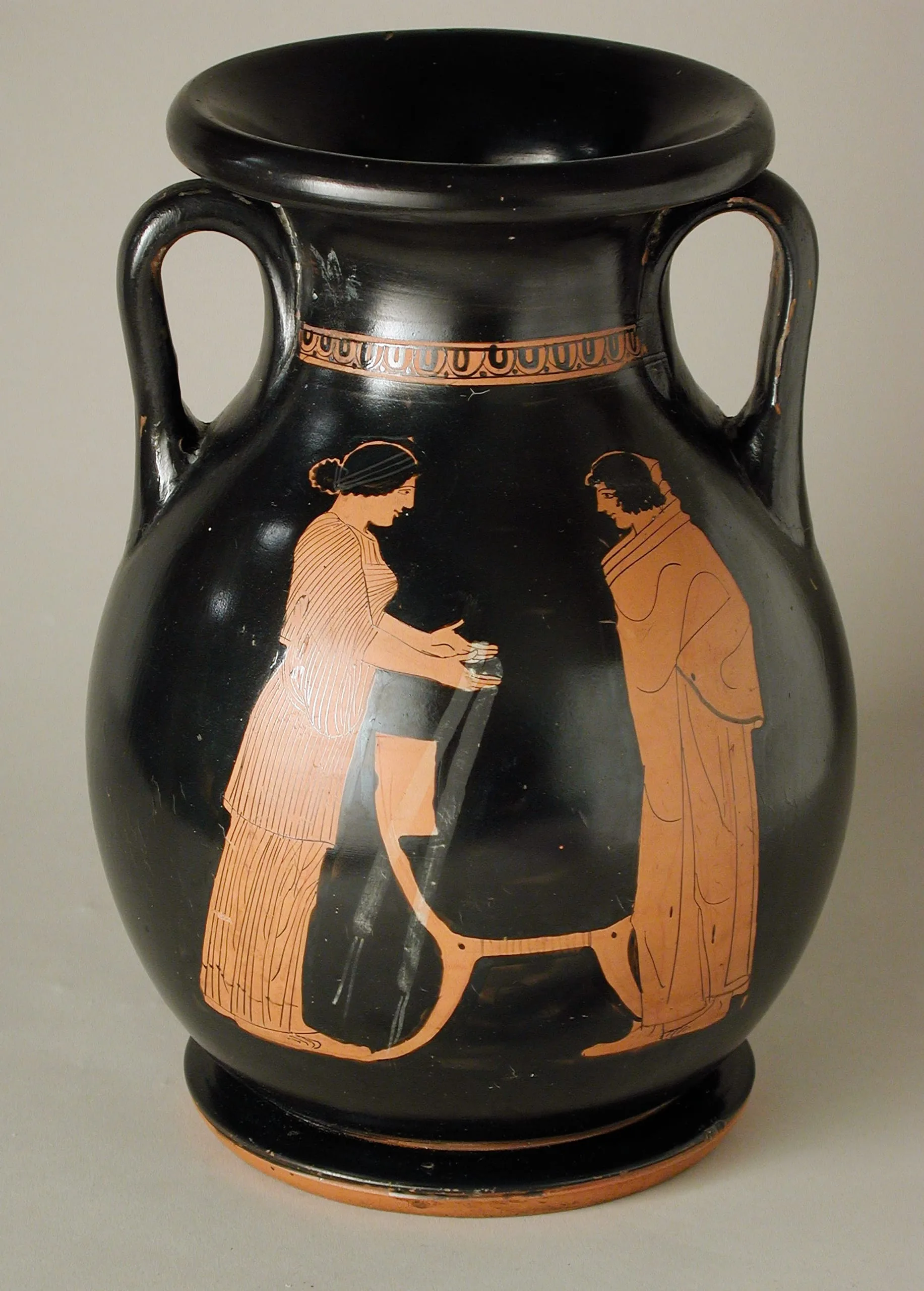 - Attic Red-Figure Pelike with (A) a Woman Offering a Sash to a Youth and (B) a Woman Pouring a Libation at an Altar