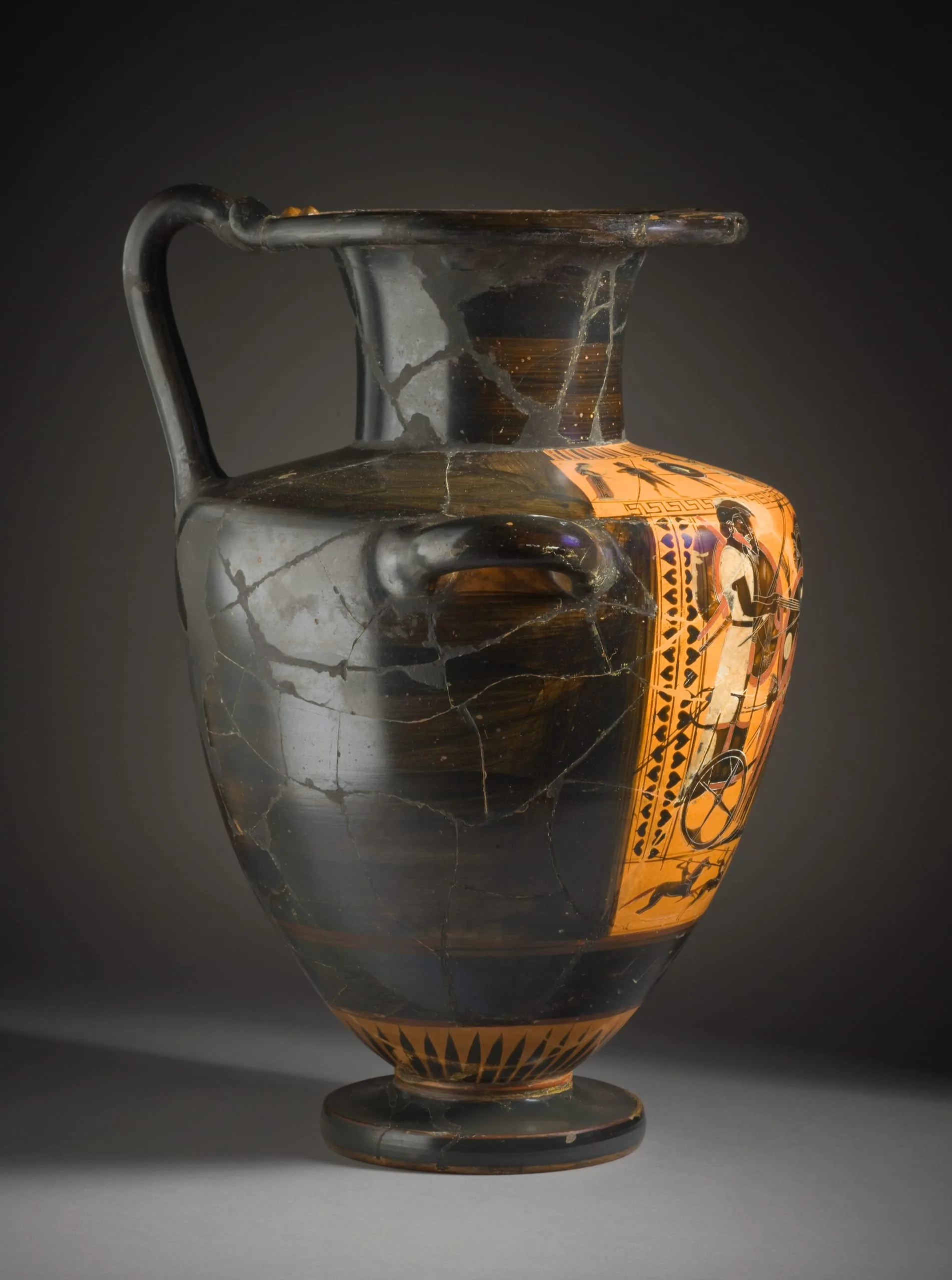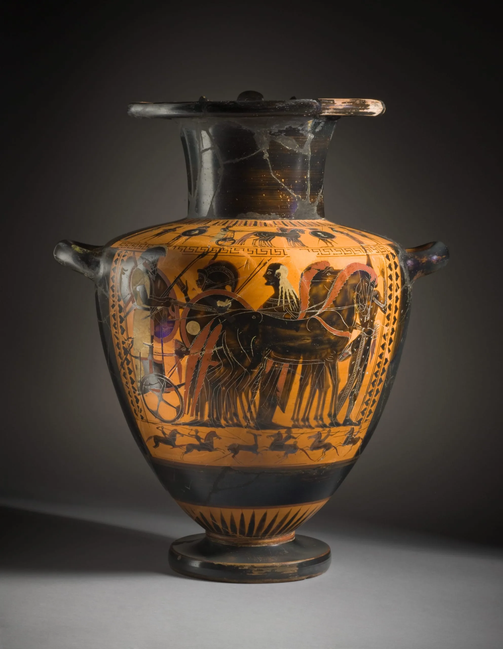 Black-Figure Hydria with Two Departure Scenes (Chariot and Warriors) and a Deer Hunt