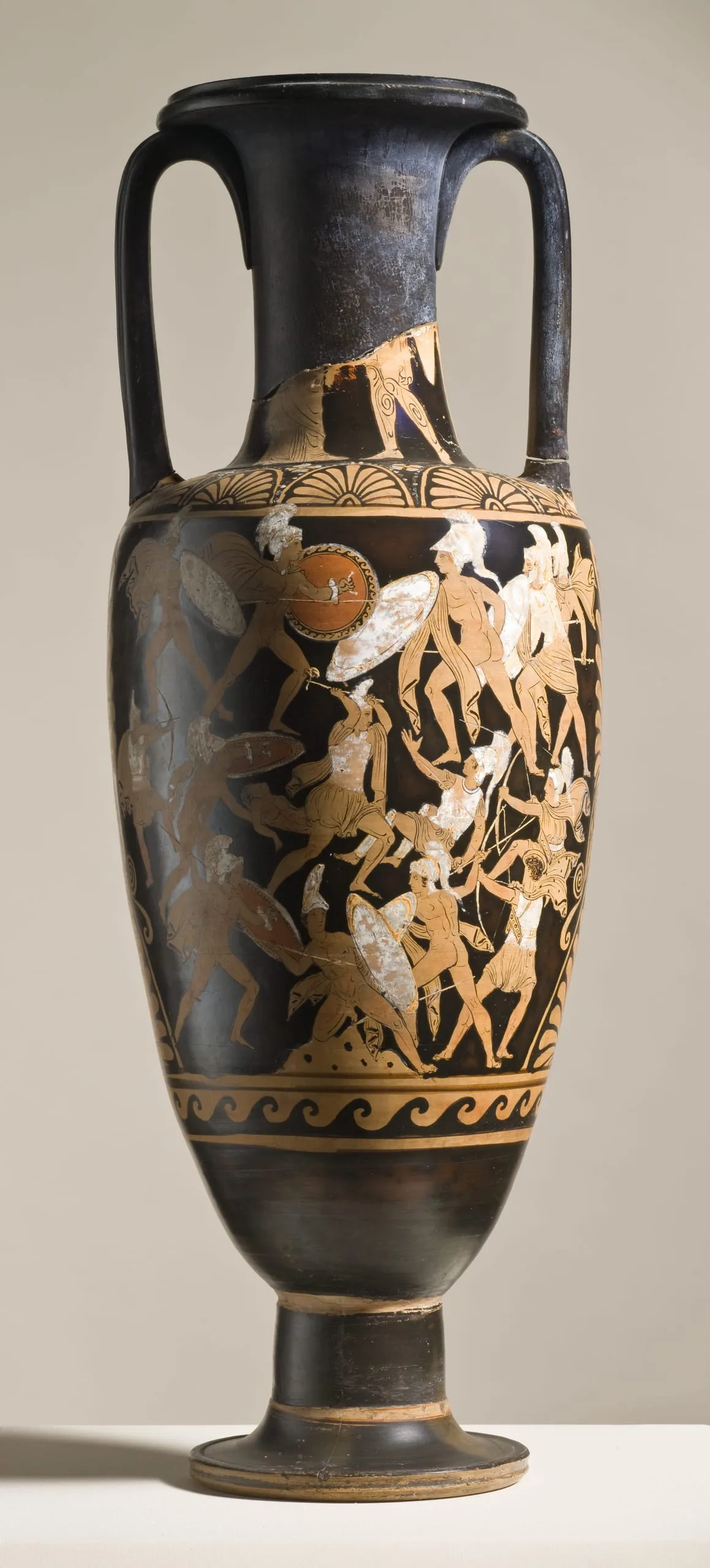 The body of the vase carries two very different scenes. On one side is a massed battle of fifteen warriors. At the centre is a soldier who pulls a nude corpse from the fray, protecting it with his shield. Many have identified the body as the Greek hero Patroklos, and seen the battle as that at Troy. Without inscriptions, however, it is not possible to be certain, although it is safe to say that the scene is heroic. It may owe something to a wall-painting; the crowded composition is certainly better suited to a flat surface, and the attempt to depict figures in space - such as the archer at the bottom right, with his back to us and only the side of his face visible - is likewise less convincing on the curved surface of the vase. The other side depicts figures at a larger scale. A woman wearing a veil and a polos (hat) holds a thyrsos and phiale before a long-haired youth, who is accompanied by a second woman, also with a phiale, who seems to turn back tentatively. The presence of Eros, flanked by a woman on either side, suggests marriage, but the identities of the protagonists remain elusive.
