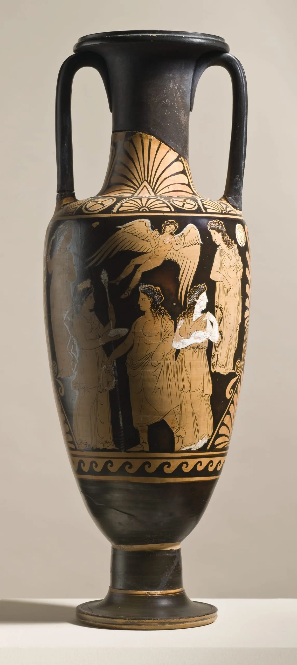 Around the third quarter of the fifth century B.C., Greek communities in Southern Italy and Sicily began to produce their own red-figure pottery. The early examples look very similar to the Athenian, but there develops a trend for particularly elaborate and crowded compositions, often richly decorated with added red, yellow and white. The most distinctive examples are the large volute-kraters produced by Apulian workshops that were destined for funerary use. This vase, however, was made in the region of Campania, and dates to the last third of the fourth century B.C. There is a large hole in the base, suggesting that at least in its final role - it was not used for storage.