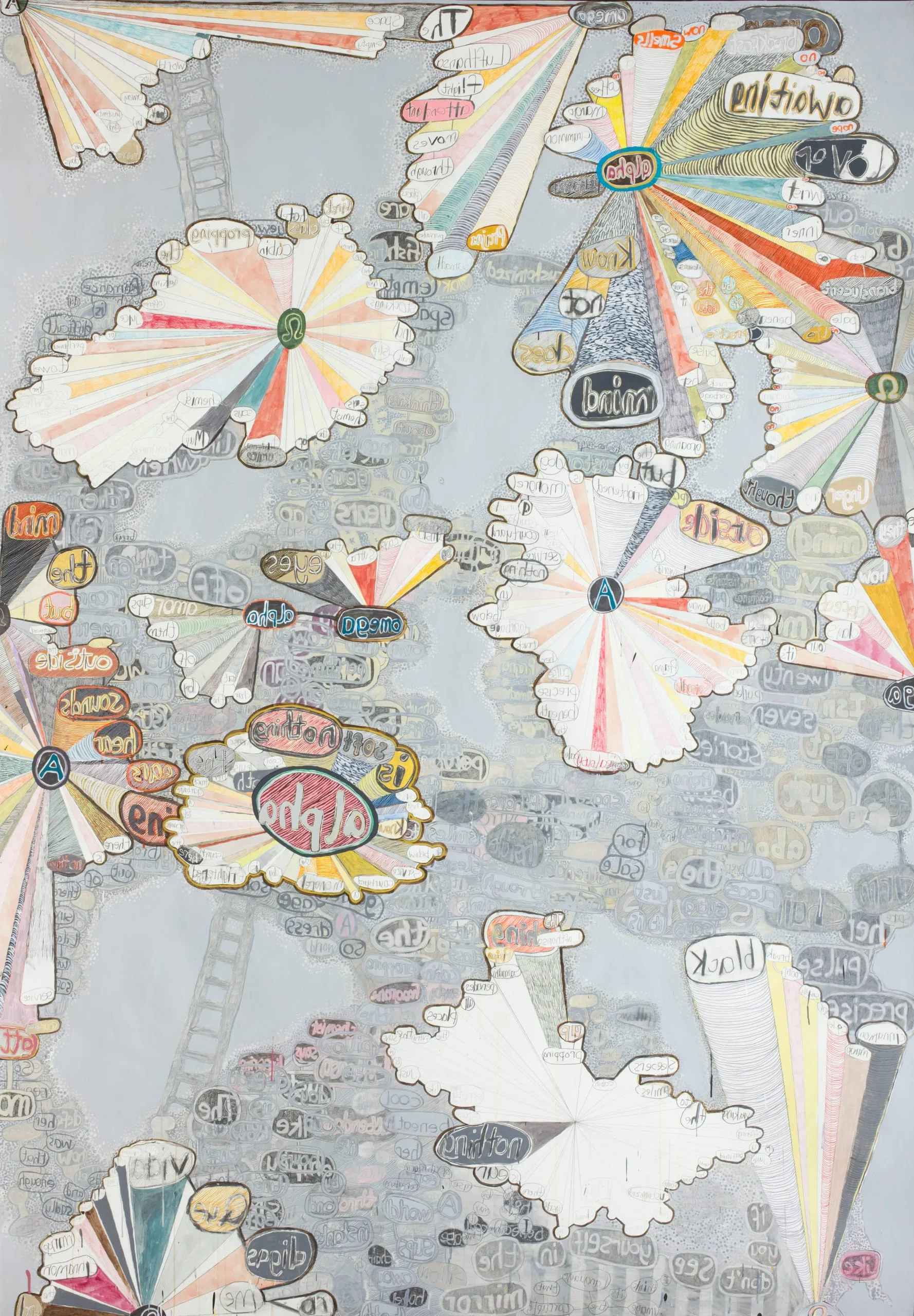 - Crayon, acrylic, felt tipped marker, graphite, gouache watercolor, and colored ink wash on heavy rolled paper