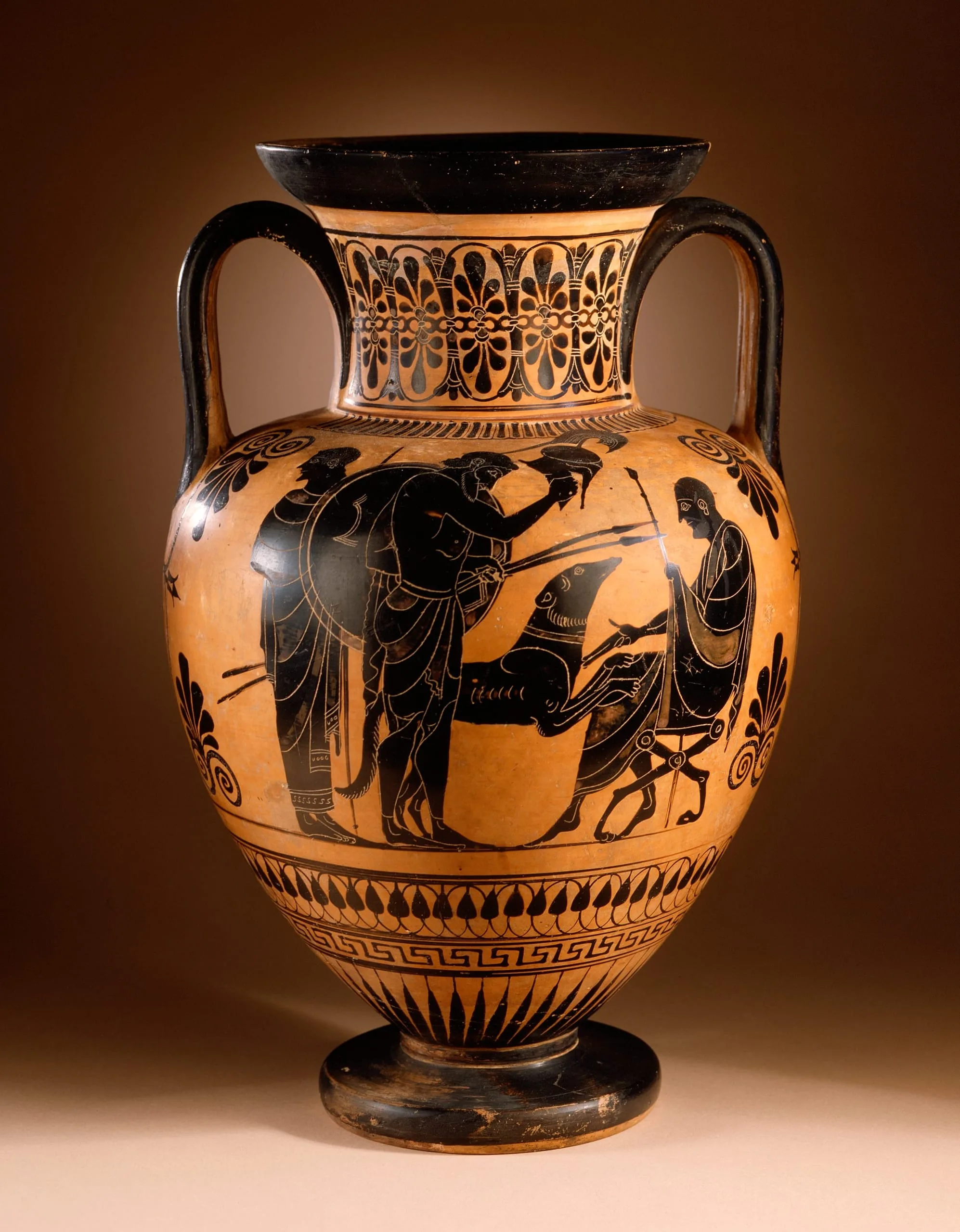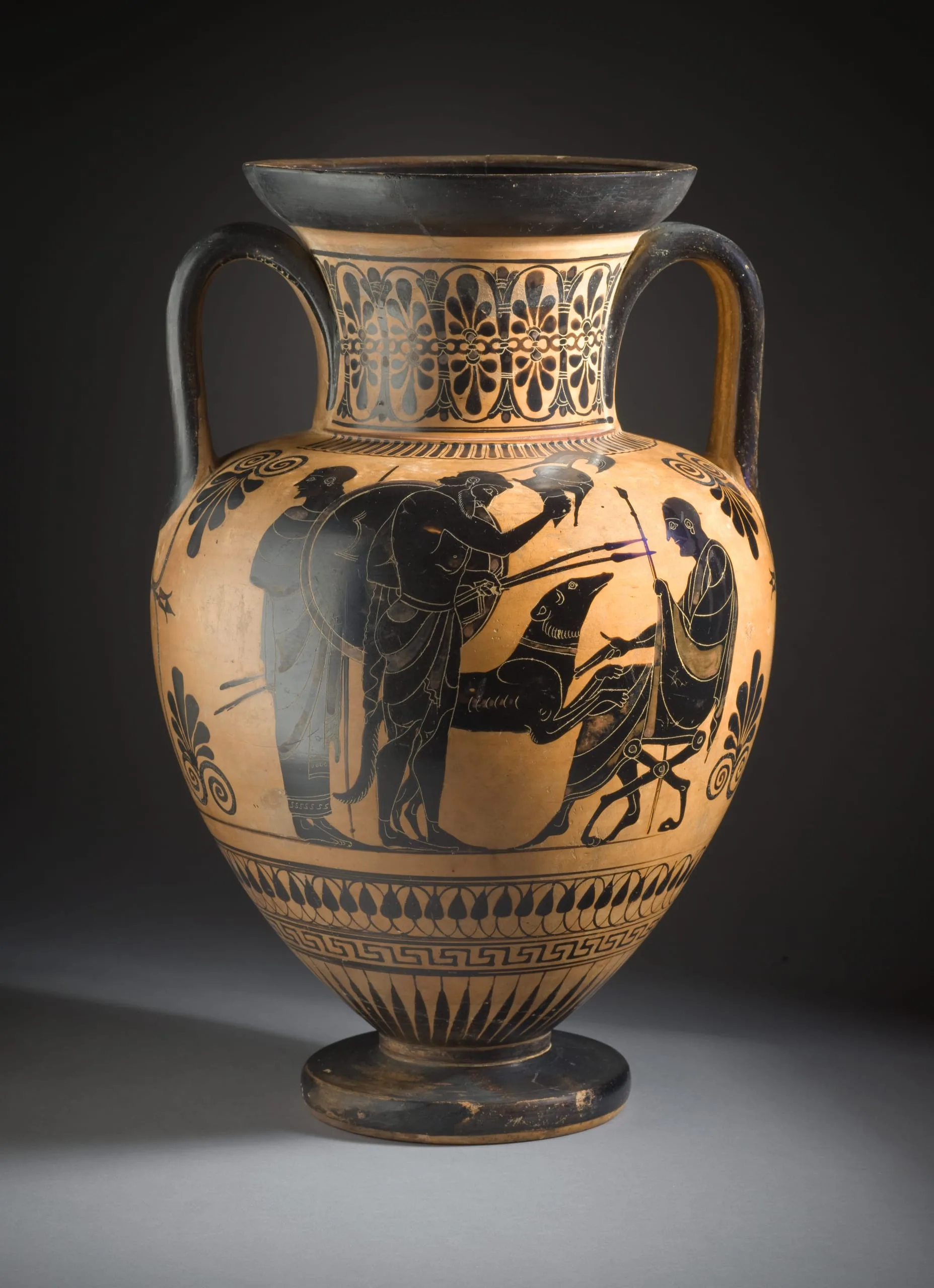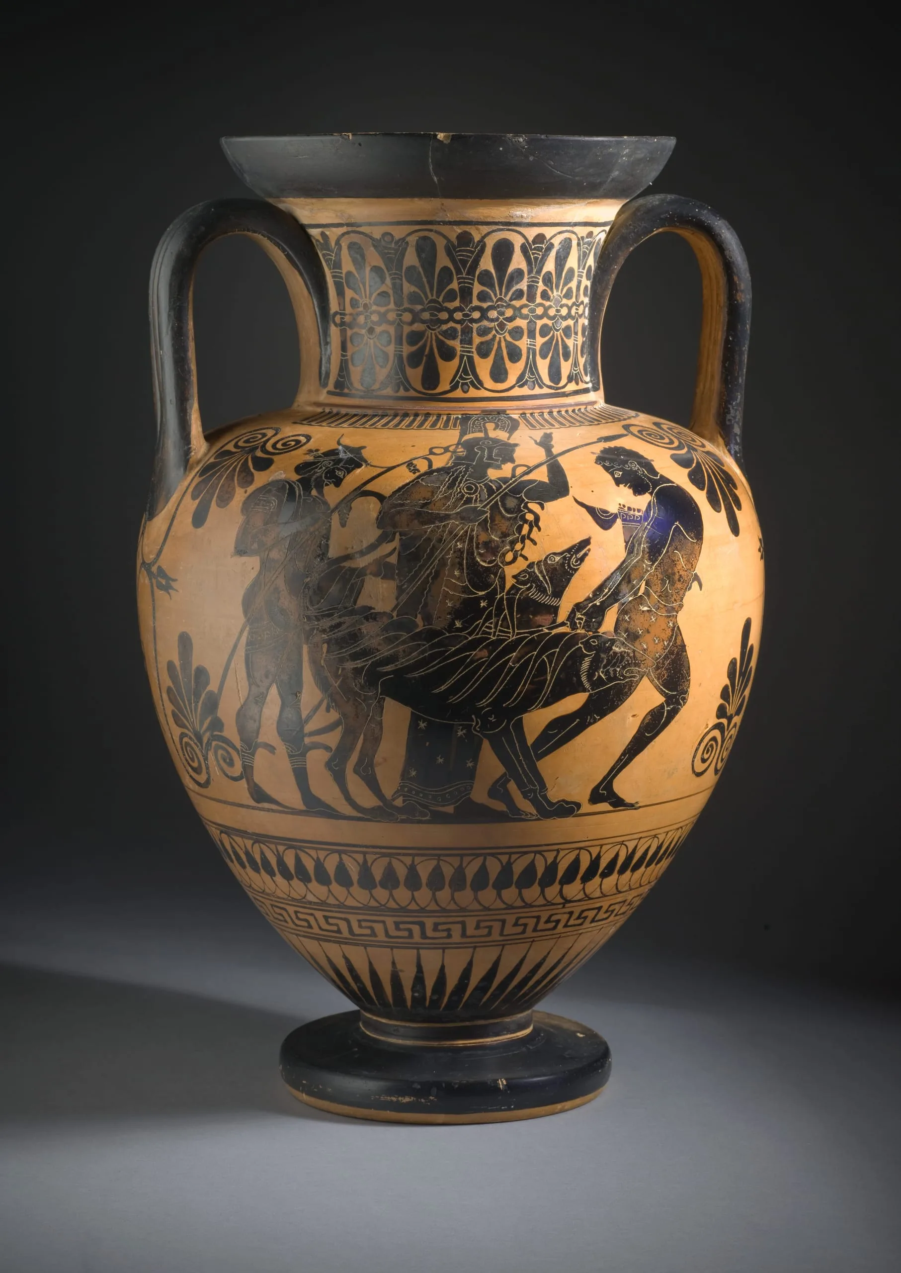 This neck-amphora is decorated in the black-figure technique figures and ornament painted black on the clay ground, with details rendered with incision and additional red and white. The technique was established in Athens by the late seventh century B.C., and continued to be dominant until the beginning of the fifth century B.C. This neck-amphora was produced around 525-500 B.C., an excitingly creative time in the Athenian pottery workshops, when the new red-figure technique was developed. This vase shows that there was still much that could be done with black-figure.