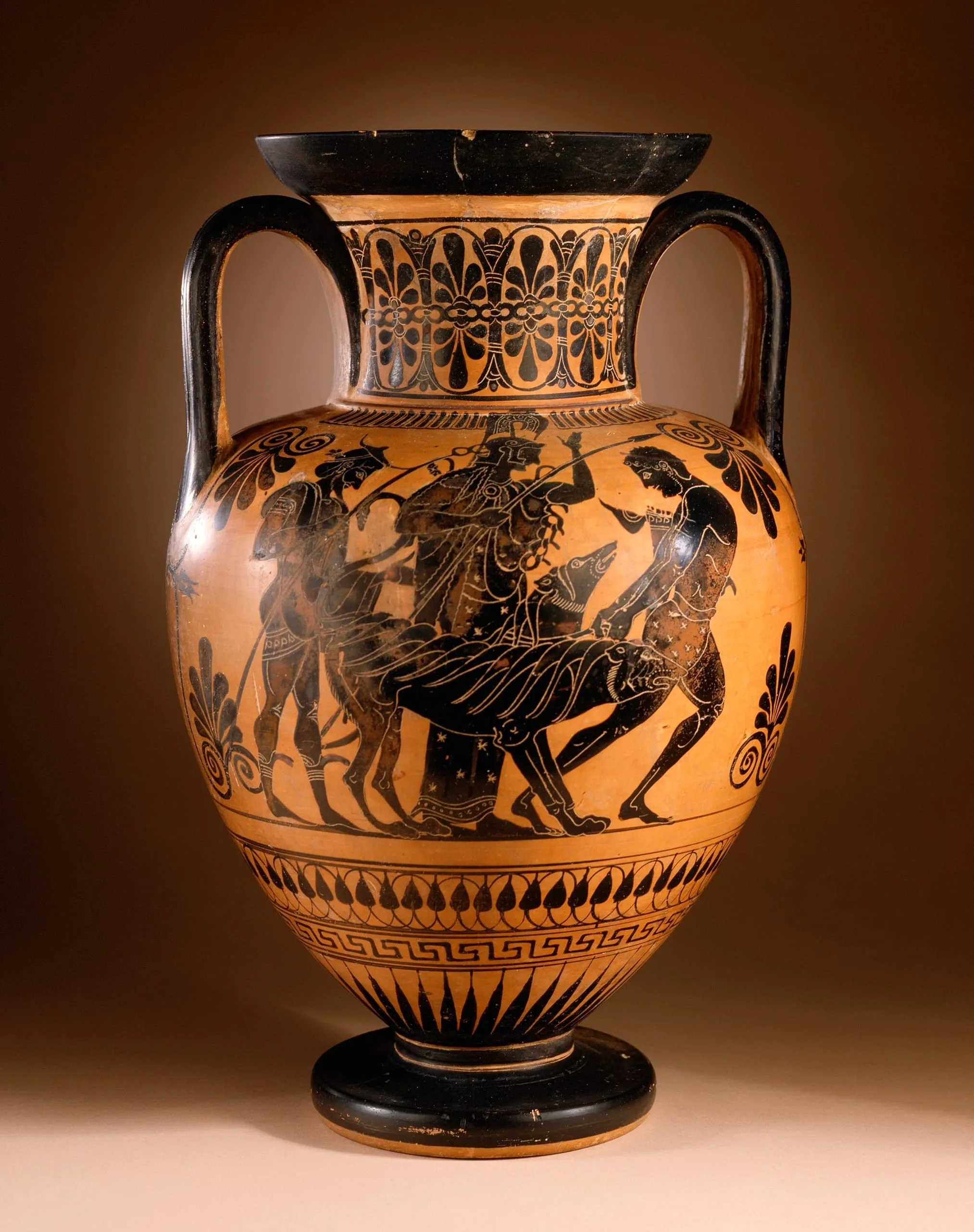 Side A depicts the Greek hero Herakles leading the savage many-headed dog, Kerberos, protector of the Underworld. In order to satisfy the Argive king Eurystheos, Herakles was set twelve labors that required him to face seemingly invulnerable opponents, and often to journey to distant realms of the known world. To retrieve Kerberos, Herakles had to enter the Underworld, the realm of the dead, and to return; truly a task for a super-hero, and Herakles success can be interpreted as a triumph over death. He is depicted on this vase hauling the dog, its front paws stuck firmly on the ground. Athena, Herakles divine supporter, stands by, her hand raised in a gesture of encouragement. At the left, Hermes, identifiable by his winged boots, kerkyeion and travelers hat, lends additional support. He is the god who oversees journeys, including the transition from life to death, and so his presence is appropriate.