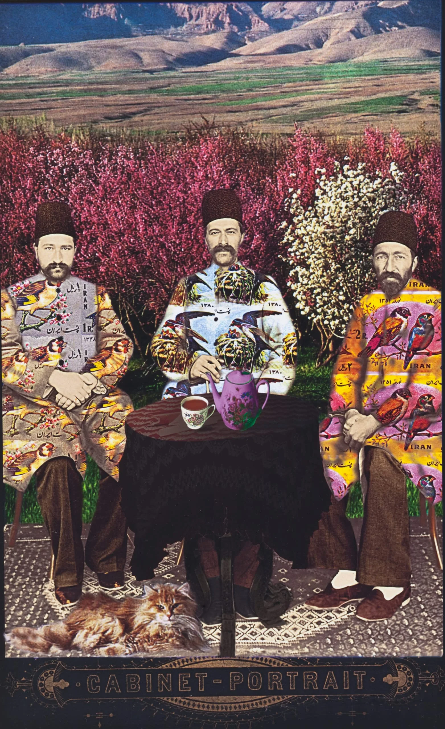 In her "Updating a Family Album" series Malekeh Nayiny begins with black-and-white photos of relatives in Iran and adds, somewhat anachronistically, to the staid compositions brilliantly colored decorative patterns and inventive props and backgrounds, which have the effect of providing a novel context for her family members. She has said of her work, "I have used computer technology as a kind of time machine to update my family album, to lend it more color and life, to renovate and revive it." Her intention was not only to see her relatives in a new light but also to assimilate the different pieces of her own past. For example, in "Three Uncles" she has overlaid the men’s garments with early-twentieth-century Iranian postage stamps of exotic birds, which had been collected by her father.