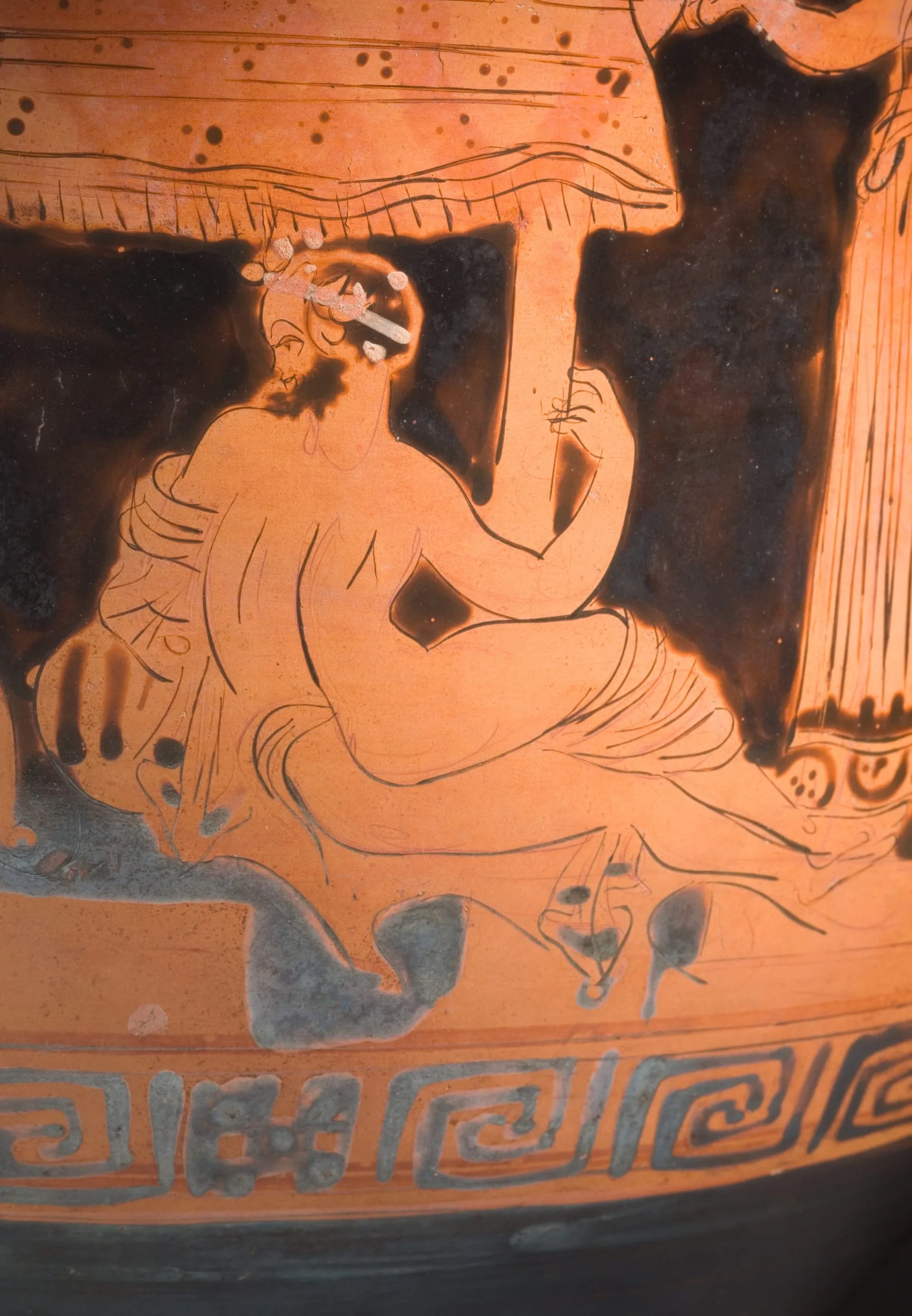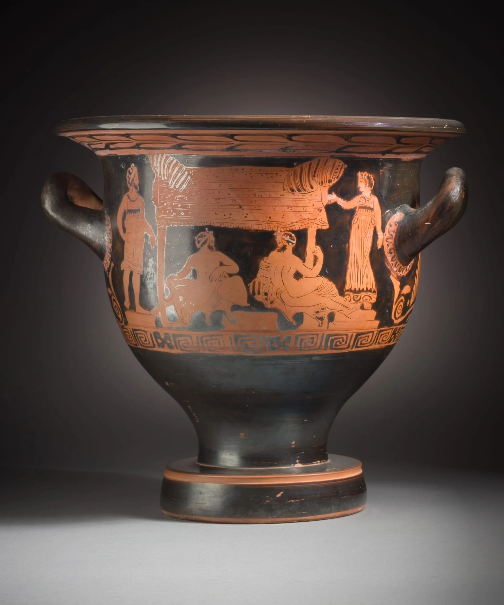 - Attic Red-Figure Bell-Krater with (A) Unexplained Scene (Two Satyrs Reclining before a Colossal Couch) and (B) Three Youths