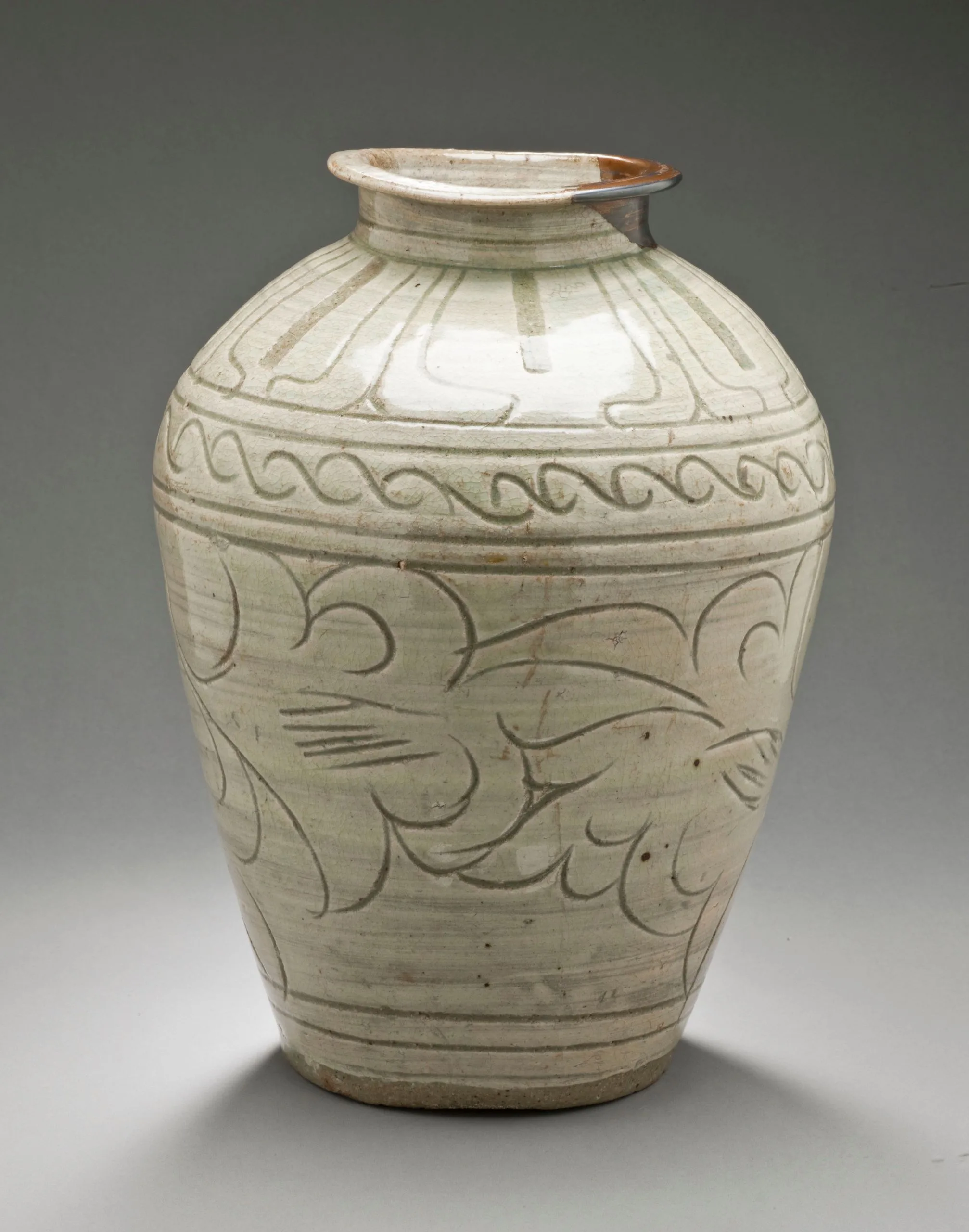 - Buncheong ware; stoneware with incised slip decoration and pale green glaze
