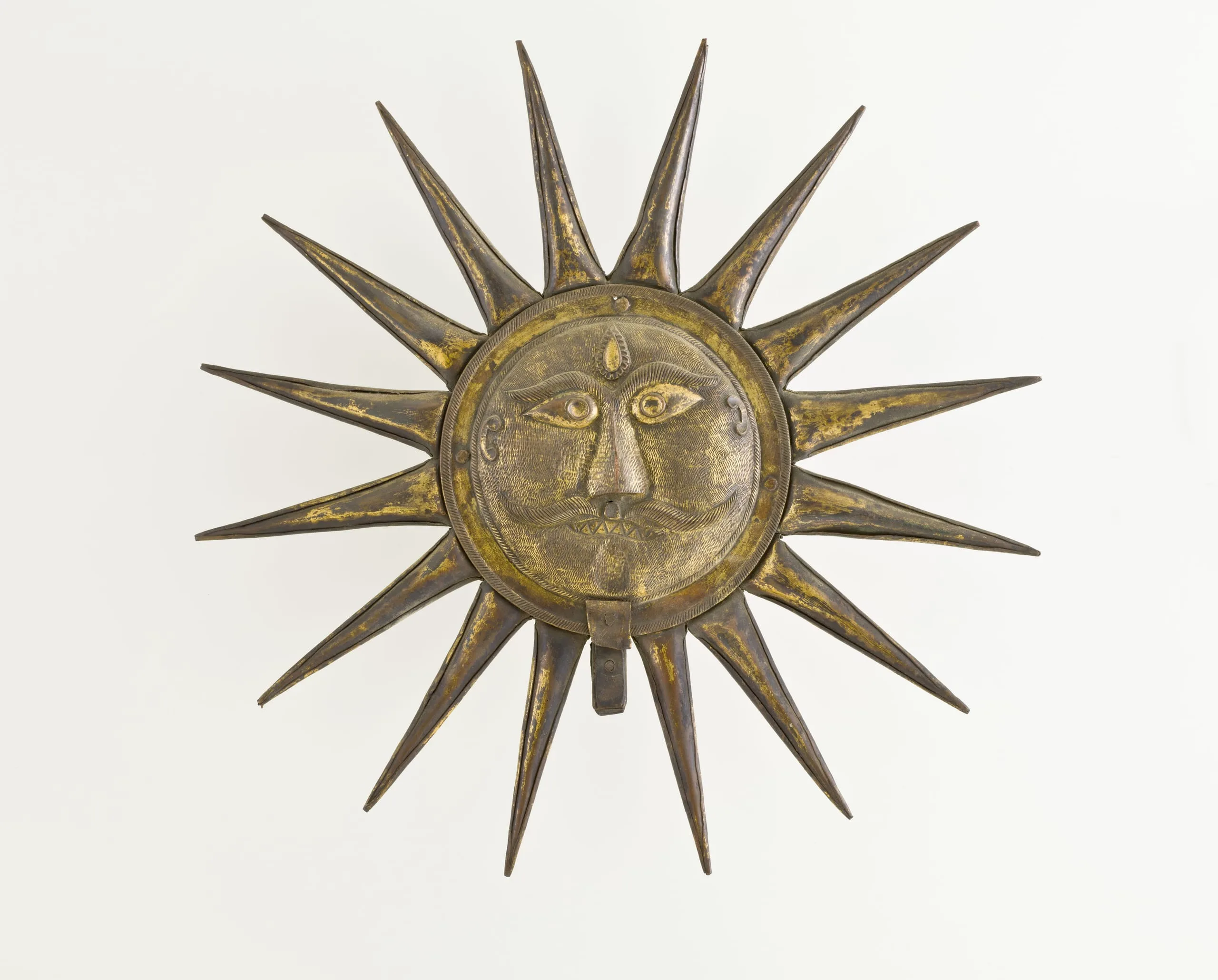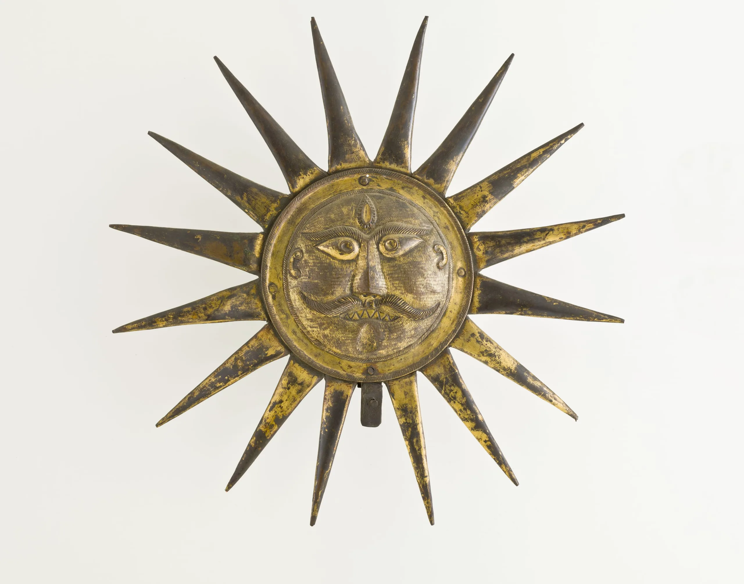 This personified sun emblem was originally used for honorific and ceremonial purposes in the former royal court of Mewar in Rajasthan. The Mewar dynasty traced its distinguished Rajput lineage back to a legendary descent from the Sun-God, Surya. Accordingly, their state emblem was a golden face of a personified sun, often encircled by its emanating rays. The Mewar solar face was typically round with elongated eyes, a prominent mustache, and sectarian markings on the forehead. It was used frequently to embellish palatial architecture and the trappings of royalty. Mewar paintings are replete with depictions of processional standards topped with culturally symbolic finials in the form of personified sun emblems, royal parasols, and additional stately emblems, called aftadam or alamat, which were held aloft by retainers over the heads of Mewar rulers to proclaim their exalted status. The most common solar finials depicted in Mewar painting are circular, with the personified face of the sun in the center surrounded by a pearl border and a broad black areola made of black ostrich feathers or black felt. Occasionally, the areola is white or red with floral motifs. Additional styles of processional finials were teardrop-shaped, sometimes with lobed borders, and embroidered with floral sprays.