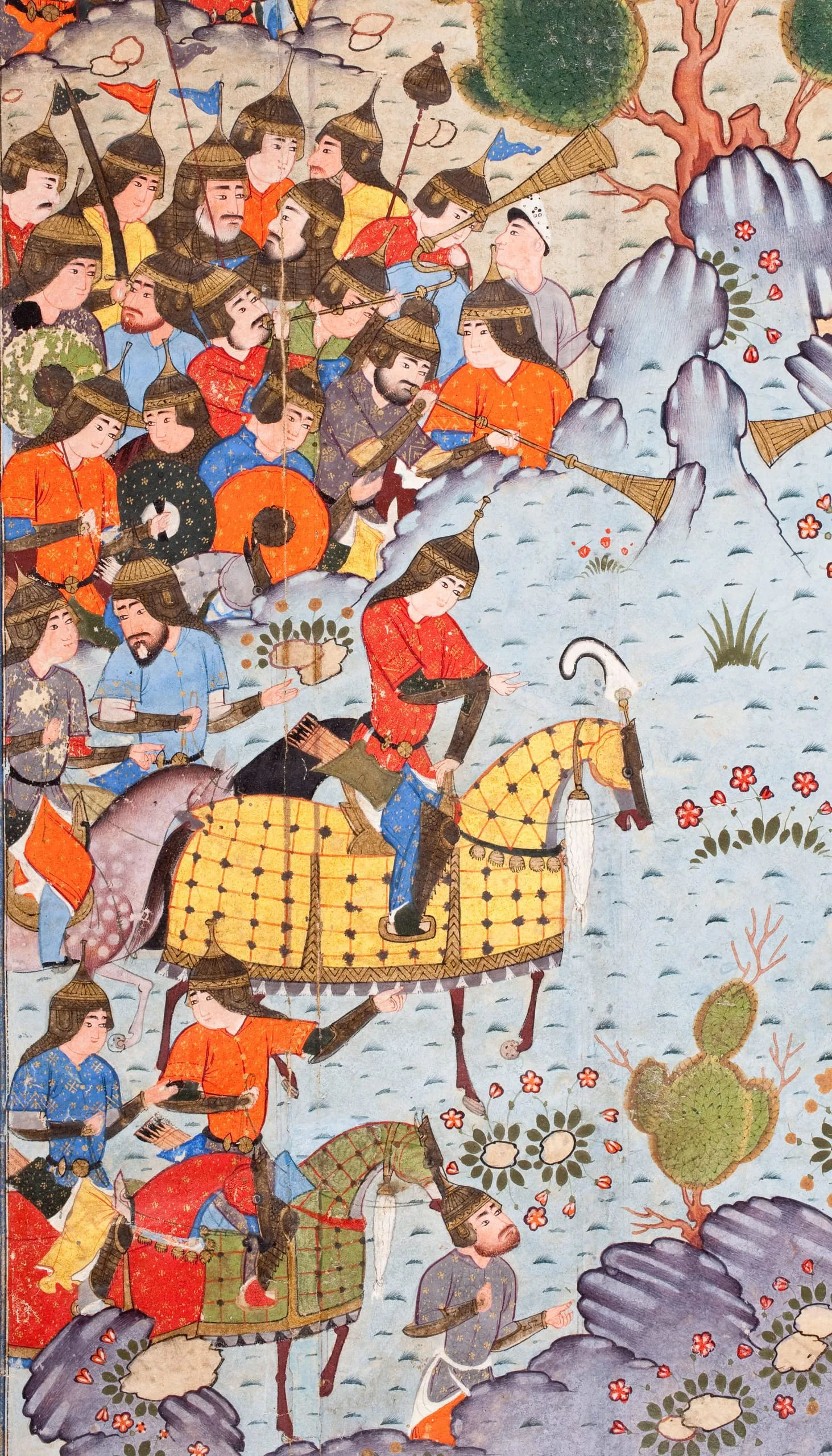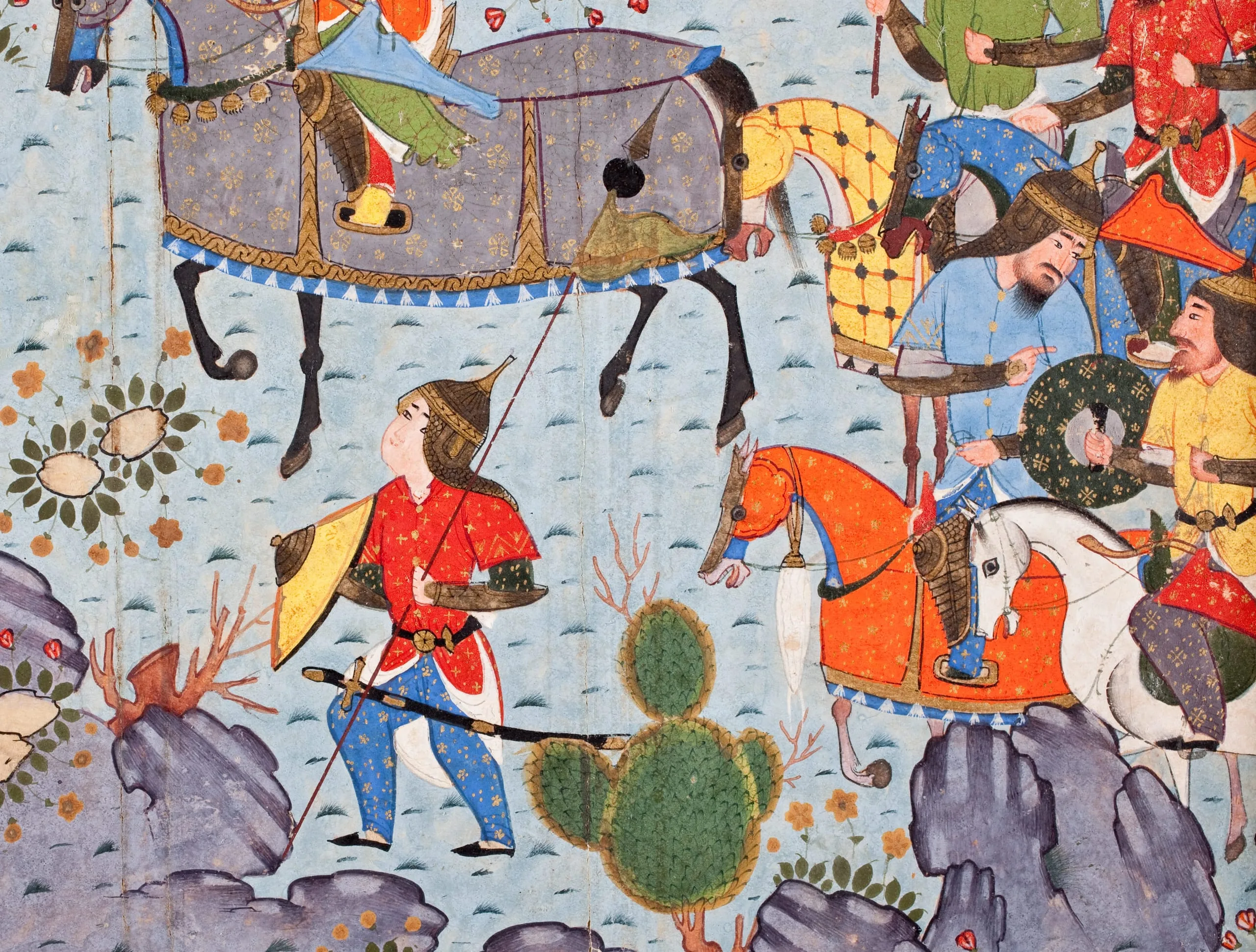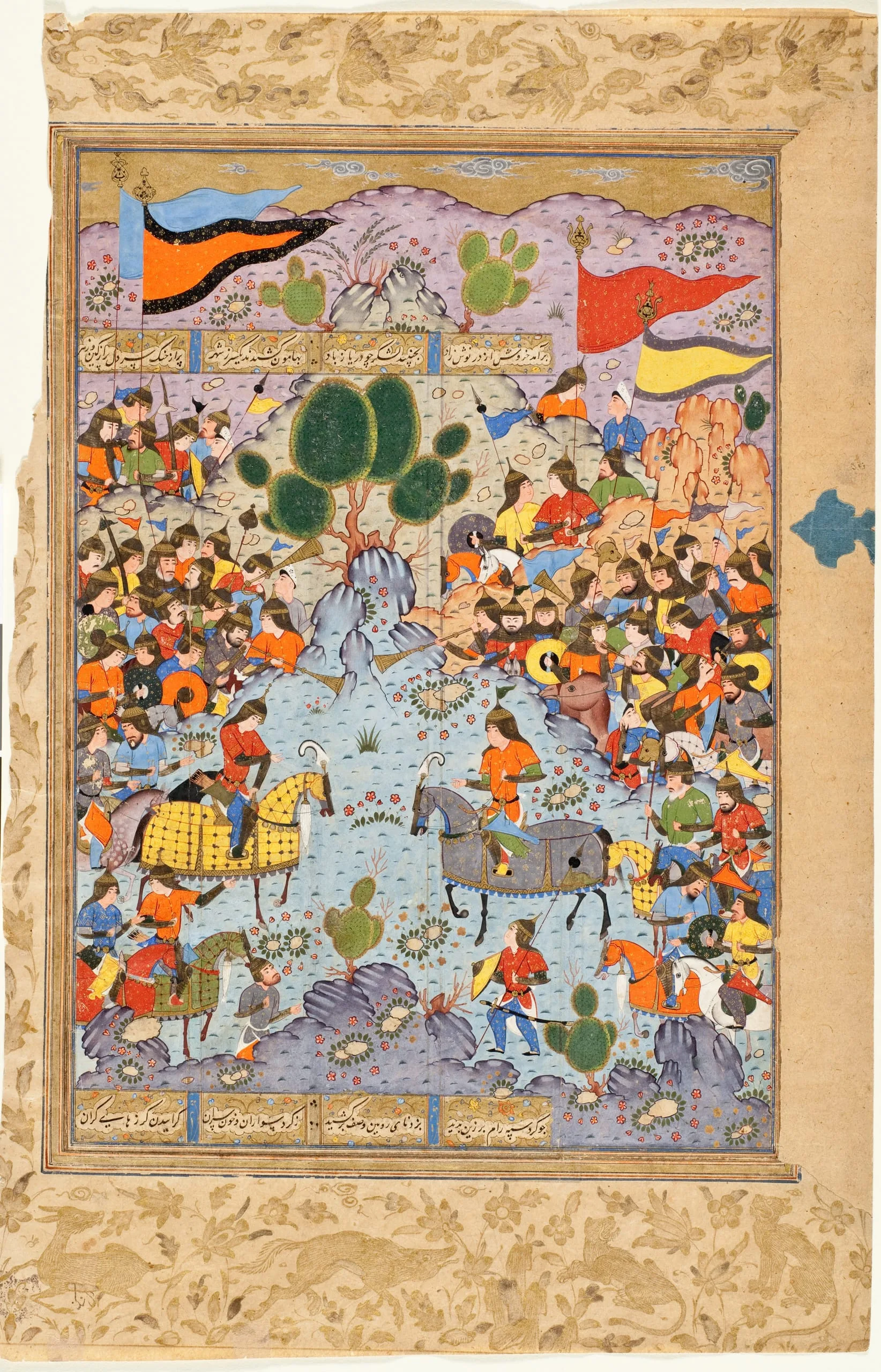Shahnama, or Book of Kings—which tells of the pre-Islamic kings and heroes of Iran. As is typical of the best Persian miniatures, the paintings portray an idealized world, one that belies the impending violence at the heart of each composition. Here the richly burnished colors of the costumes, the complementary poses of the figures, and the carefully contrived landscapes, which include hues not found in nature, combine to create dramatic if unreal settings for combat. Scenes of epic proportions filled with minute detail, these pages demonstrate an essential characteristic of Persian miniature painting, in which the figural and landscape elements and other features can be repeated and recombined but with a new color scheme, to create each time a fresh composition.