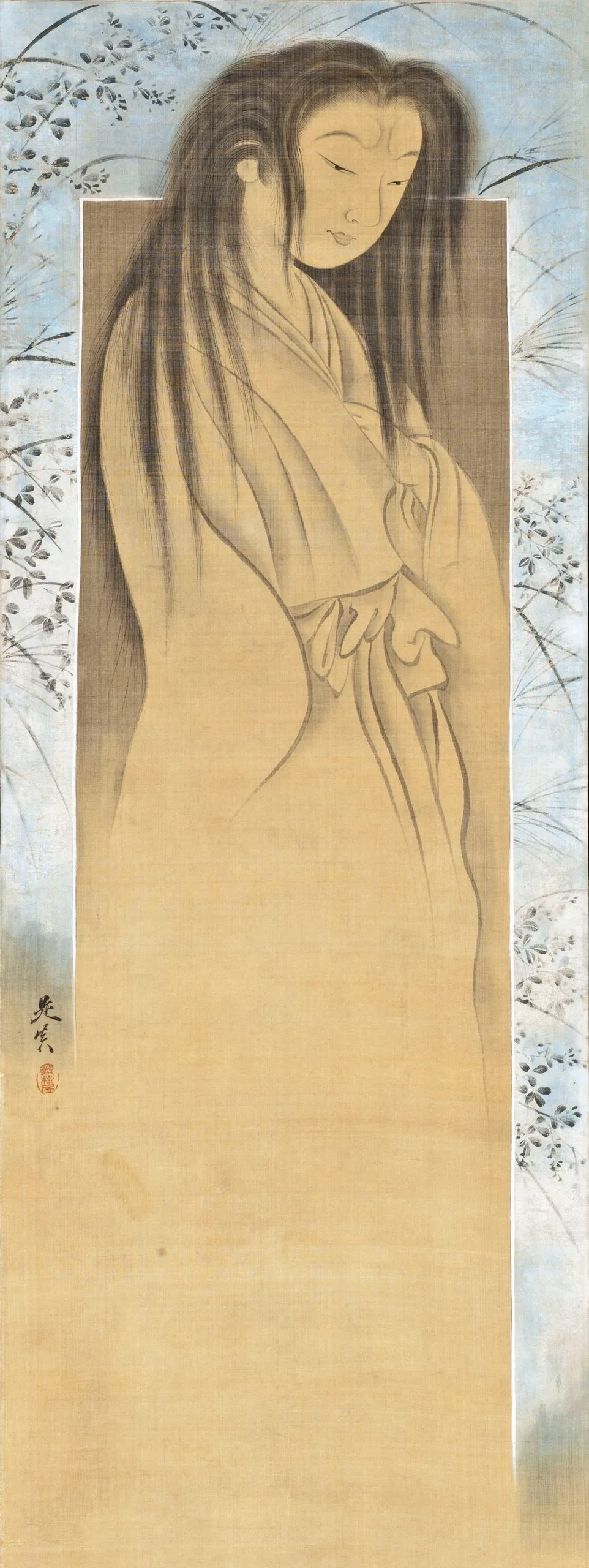 A female ghost literally rises out of the painting, entering our space. Her disheveled hair and lack of feet tells us that she is a ghost, come back to haunt the man who wronged her. She is powerful, seductive, and elegant. Bush clover fills the frame around her, indicating that the season is autumn. The mounting is a trompe l'oeil effect: what appear to be separate brocades are actually one piece of silk on which are depicted several textiles drawn in ink and color.