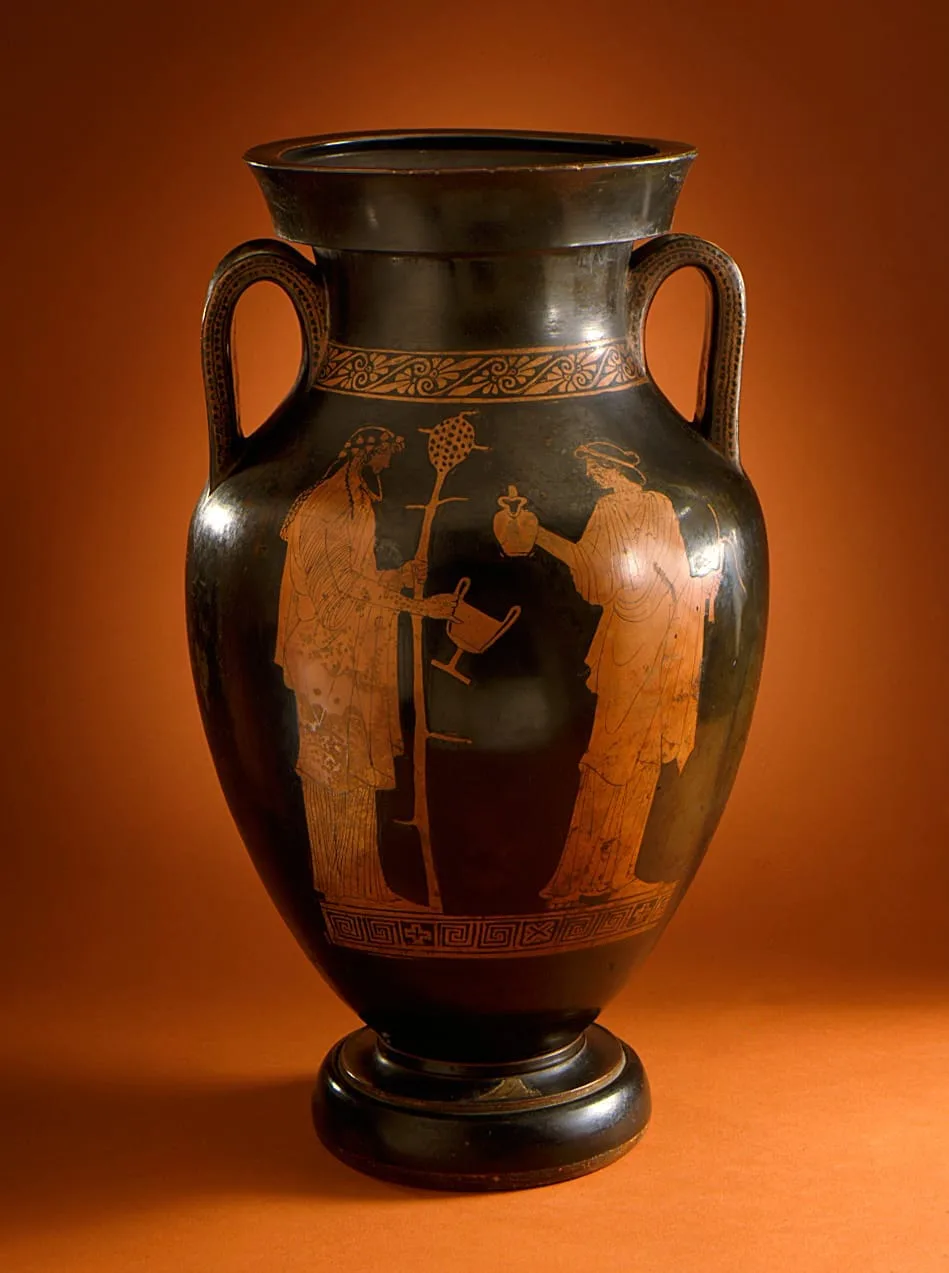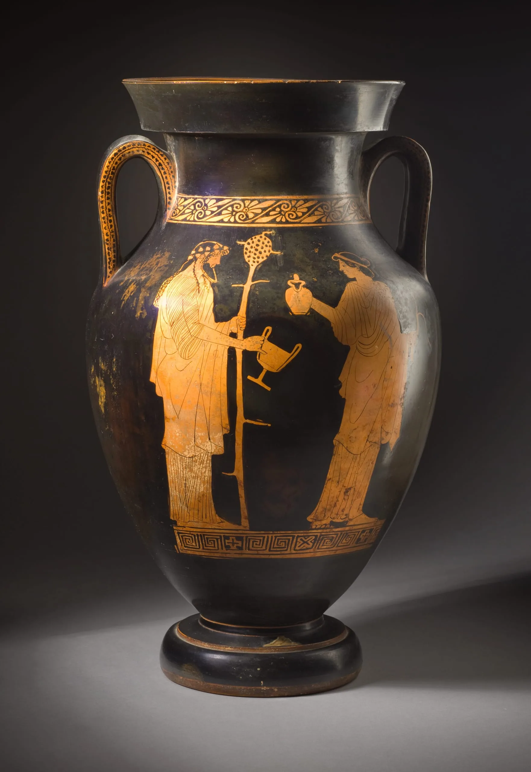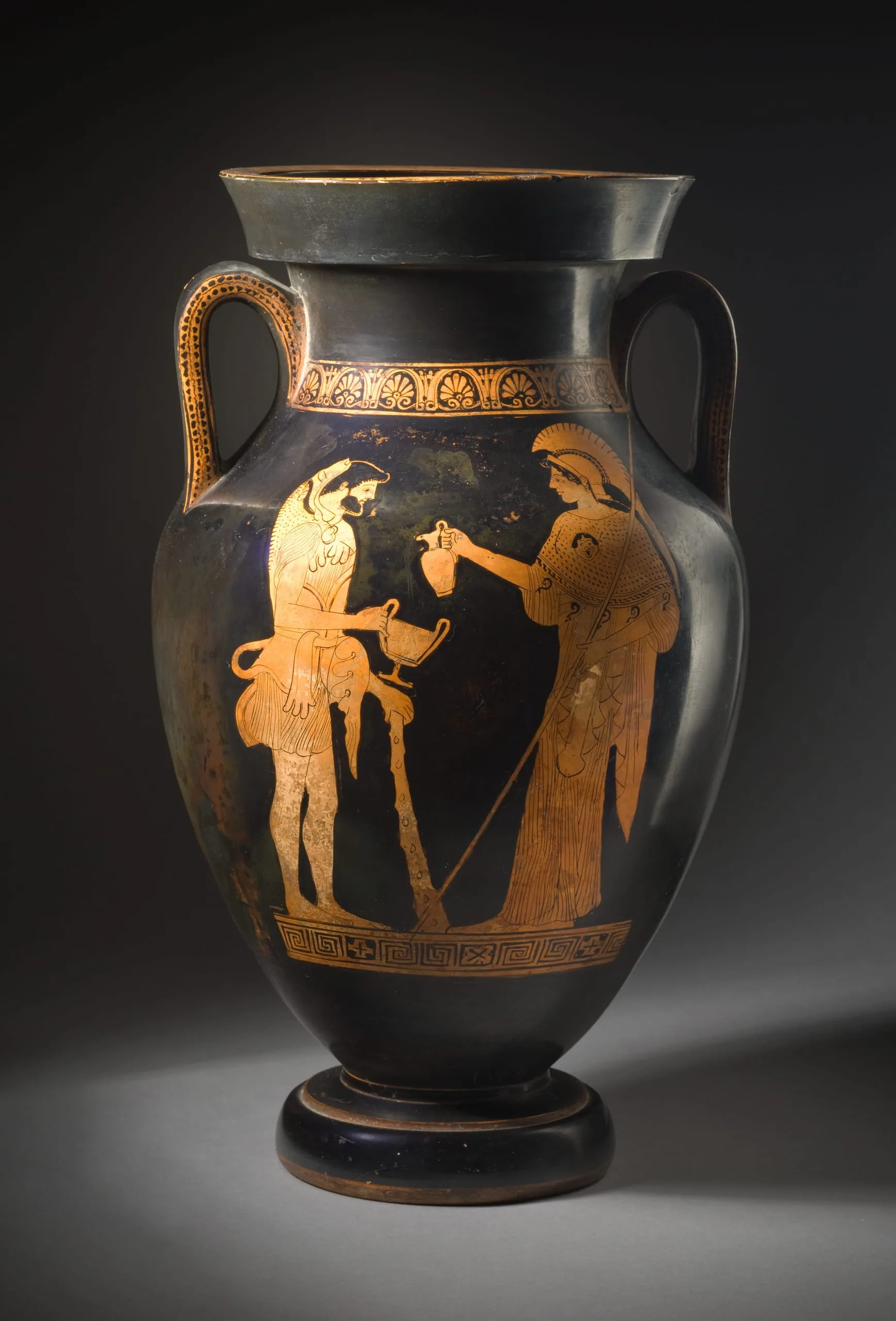 The red-figure technique, invented in Athens in the last quarter of the sixth century B.C., is essentially the reverse of black-figure. Rather than painting the figures and ornament onto the plain surface of the vase, their forms are outlined and reserved, and the background is painted black. Additional details - musculature, drapery folds - are then added to the reserved figures. Although the process of firing the painted pot is unchanged, the result is radically different, and Athenian red-figure pottery dominates the market in the fifth and fourth centuries B.C
