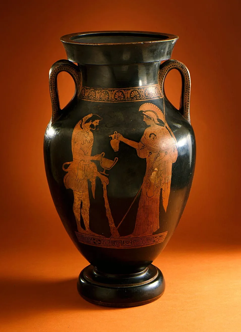 The vase is decorated with two scenes of divine repose and interaction. On one side, Athena pours wine for Herakles. She holds out a wine jar (oinochoe) and Herakles, wearing his lionskin, holds his kantharos ready. More usually seen wielding his club, here he rests on it. After his death, Herakles joined the gods on Olympus, and there are many vases that depict his introduction to his divine companions. The composition on this amphora appears to be a version of such apotheosis scenes, with Athena welcoming her protégé after the successful accomplishment of his labors. On the other side is another pair. Dionysos, the god of wine, stands upright, wreathed and holding a thrysos, a fennel -stalk topped with ivy-leaves. He holds out his kantharos to receive the wine from his female companion.