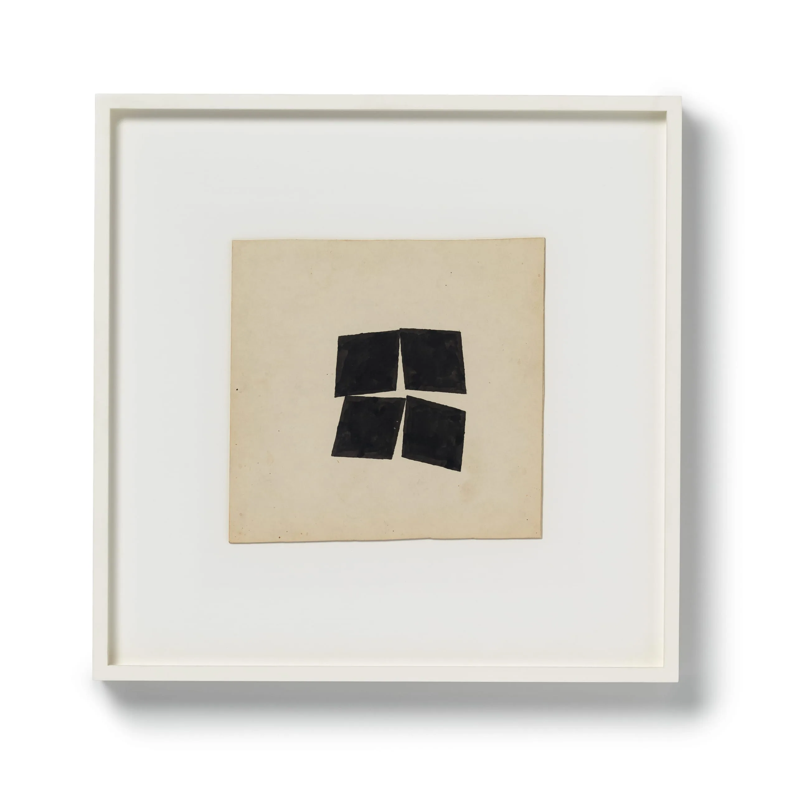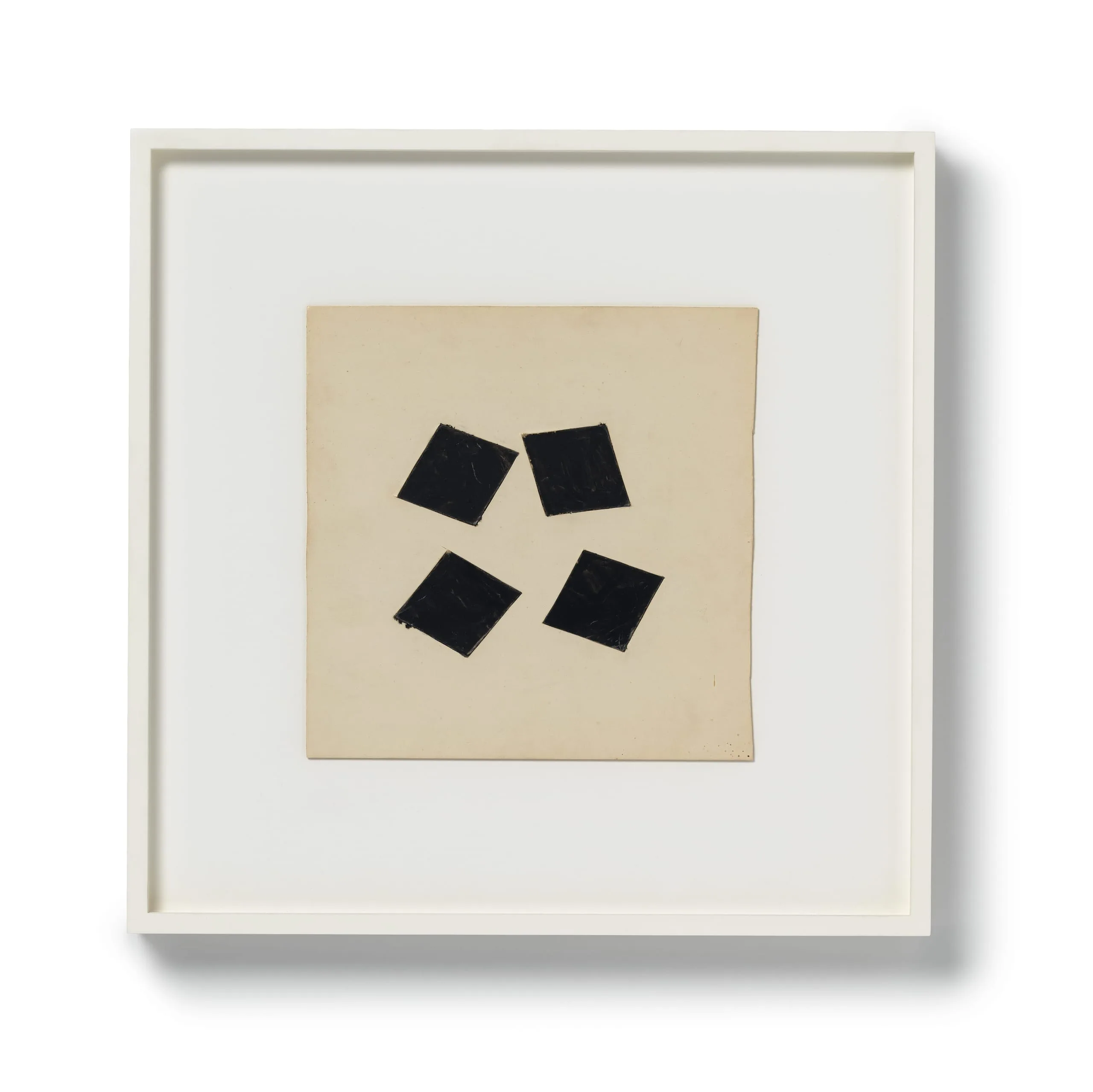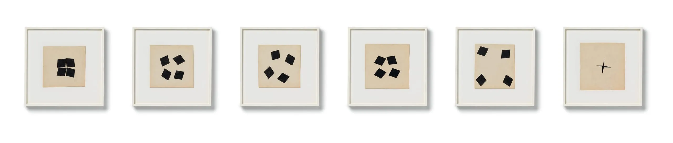 Drawing has always been central to Richard Tuttle's practice as an artist. He has declared that "art is discipline... and discipline is drawing." This suite of six untitled drawings charts a gradually fragmenting quartet of black squares (painted in gouache) on white board, as if some invisible force is slowly pulling them apart. Beginning in relatively tight, though destabilized, formation, by the fifth drawing the squares have migrated outward to the four distant corners of the board, leaving an expanse of white at the drawing's center. The sixth drawing then suddenly jolts the squares forcefully back to center, but with such velocity that they seem to collapse into one another, emitting a final flash as they careen into oblivion, as if sucked into an invisible black hole.