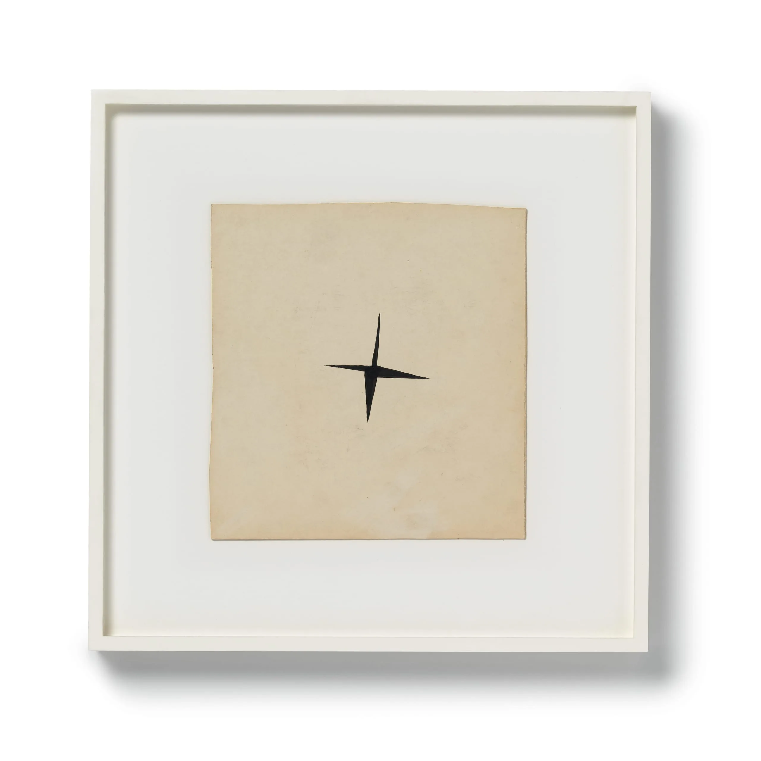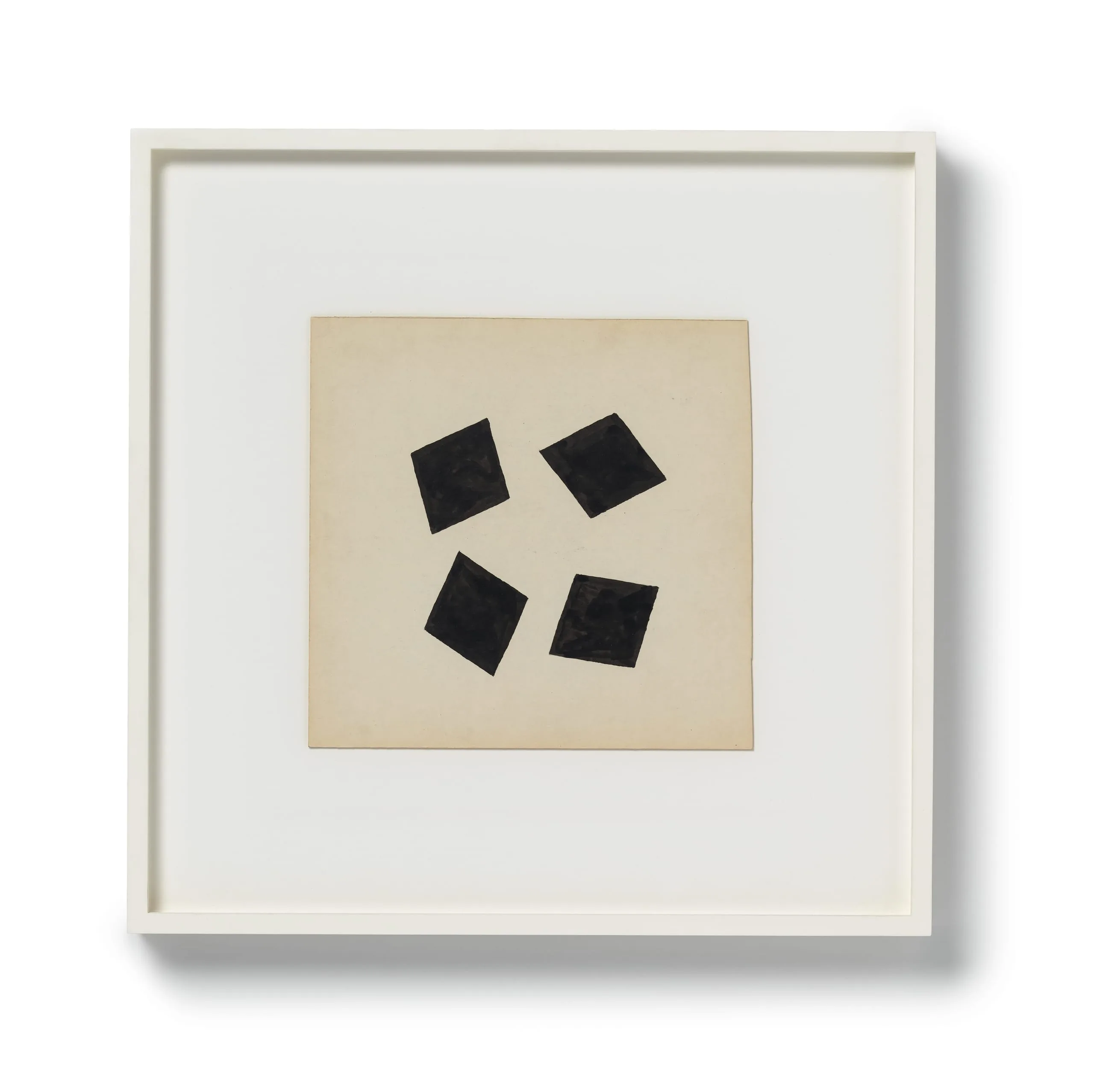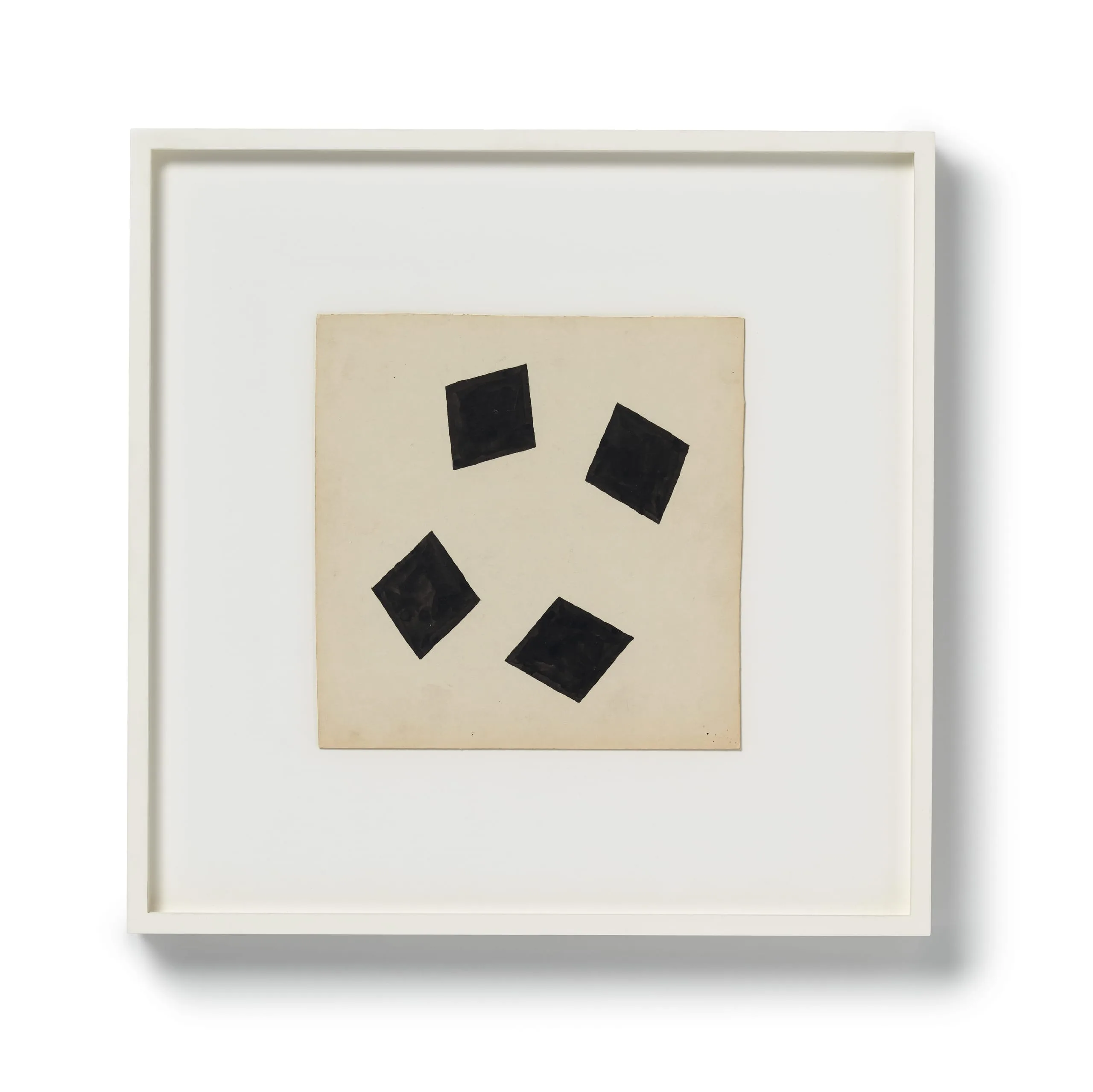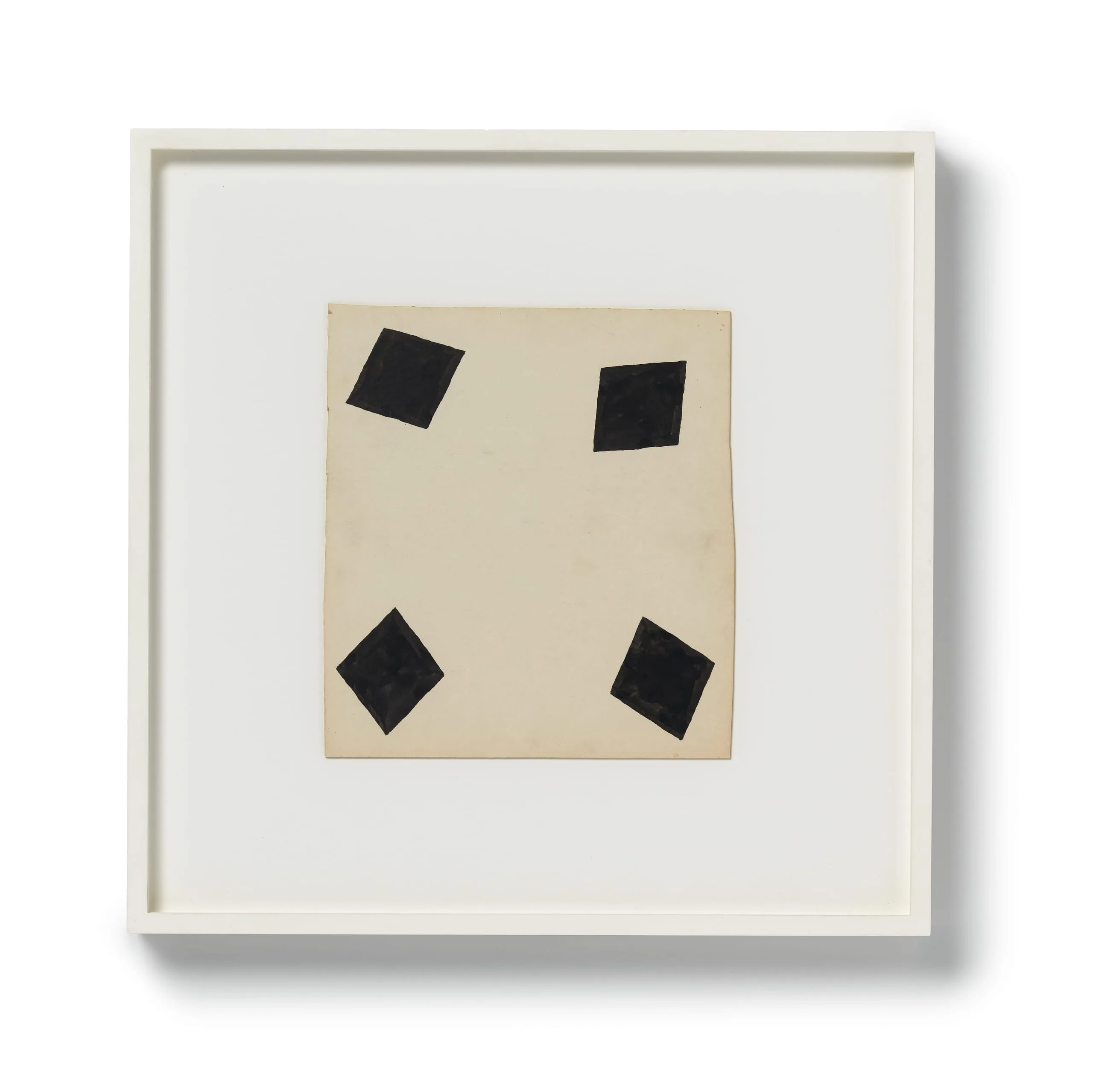 Drawing has always been central to Richard Tuttle's practice as an artist. He has declared that "art is discipline... and discipline is drawing." This suite of six untitled drawings charts a gradually fragmenting quartet of black squares (painted in gouache) on white board, as if some invisible force is slowly pulling them apart. Beginning in relatively tight, though destabilized, formation, by the fifth drawing the squares have migrated outward to the four distant corners of the board, leaving an expanse of white at the drawing's center. The sixth drawing then suddenly jolts the squares forcefully back to center, but with such velocity that they seem to collapse into one another, emitting a final flash as they careen into oblivion, as if sucked into an invisible black hole.