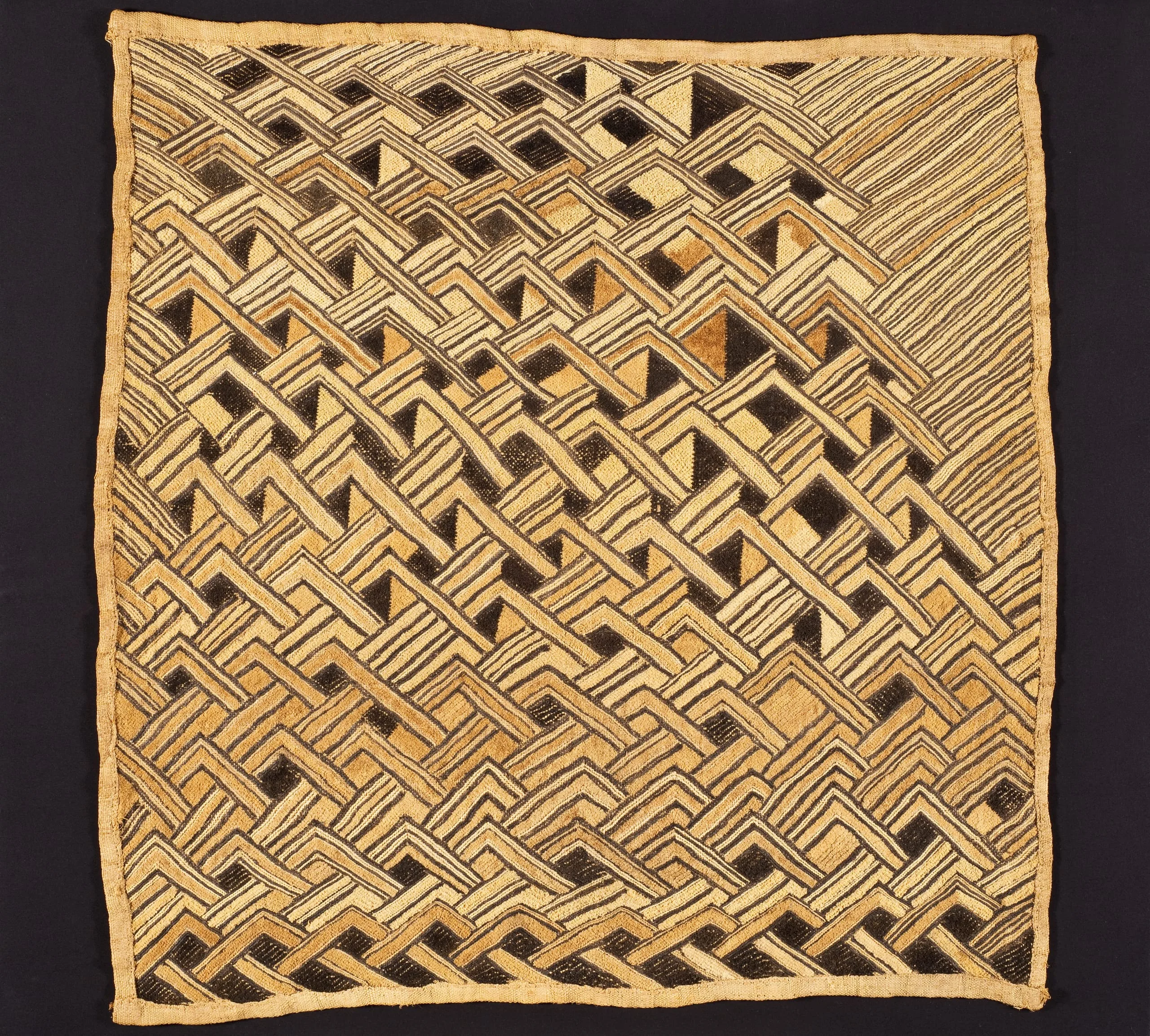 Square raffia textile with dense allover cut-pile pattern of interlocking stepped geometric forms in honey gold, cream, and near-black