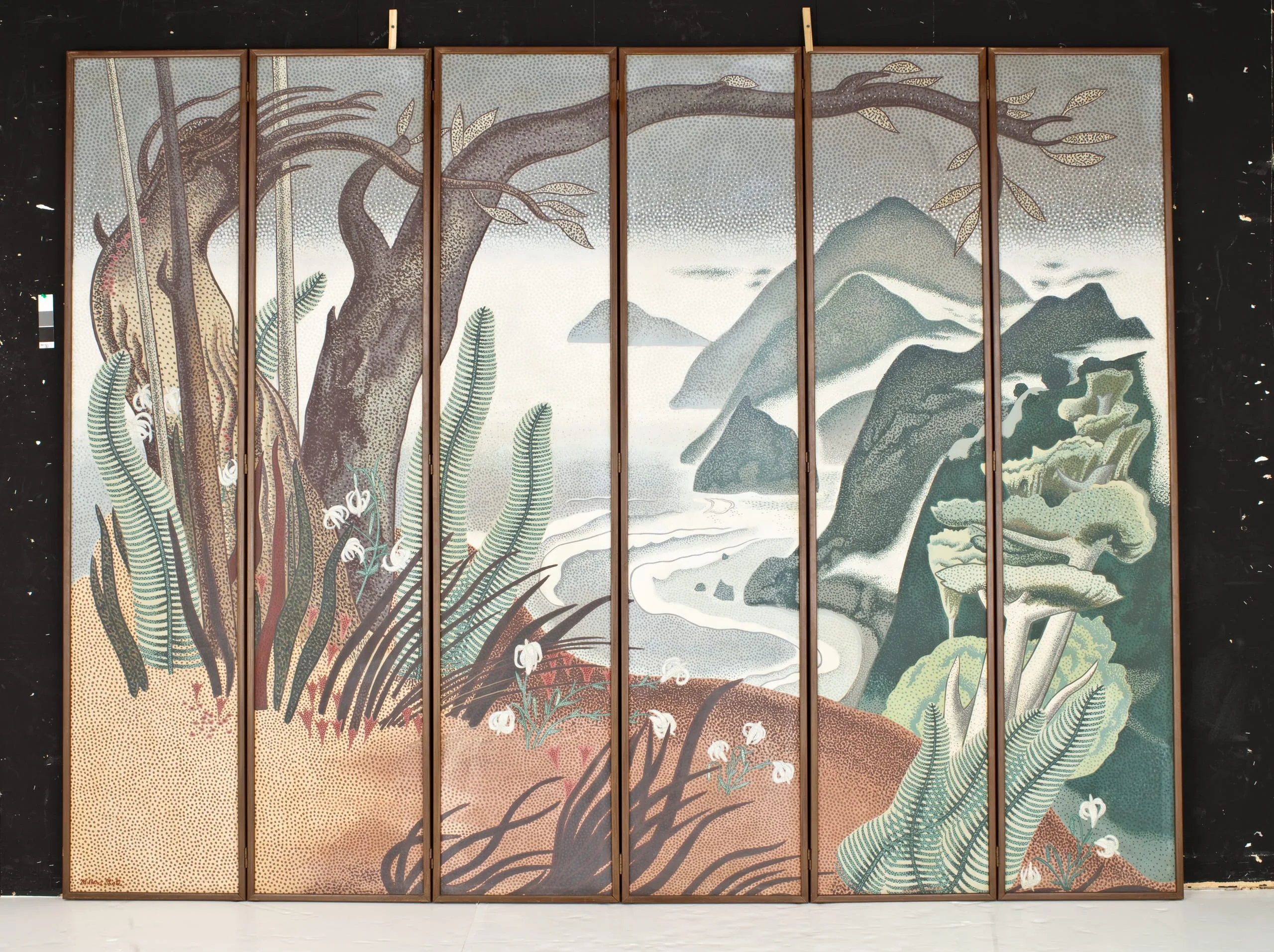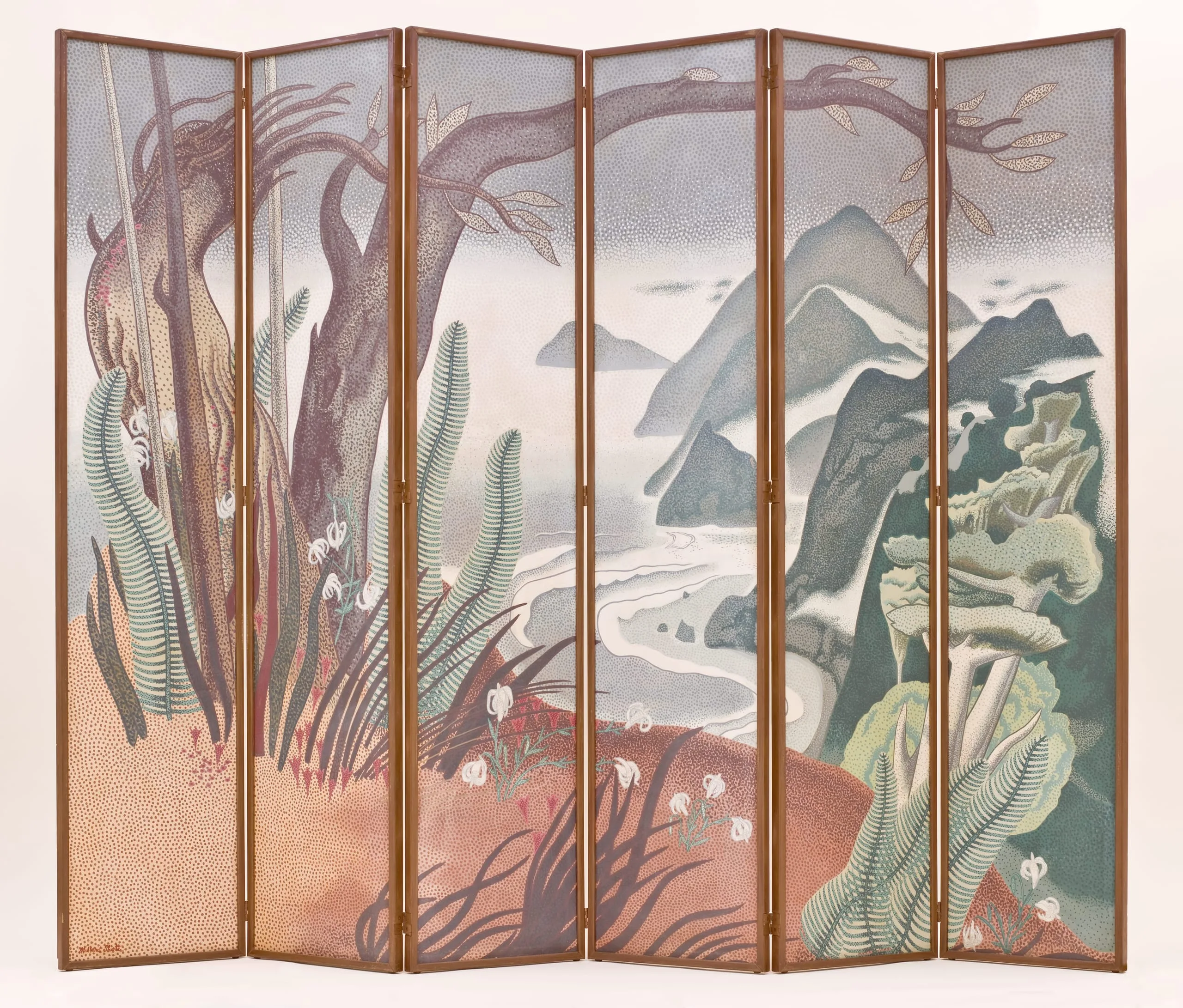 While best known as California’s foremost regionalist painter, Millard Sheets was also a hugely influential teacher and tireless promoter of decorative arts. From 1931 to 1957 he organized exhibitions at the Los Angeles County Fair that introduced broad audiences to local art, design, and craft. This screen functioned as a room divider, embodying his conviction that art should be incorporated directly into architecture. His ideals about integration were later expressed in California’s Home Savings and Loans banks, for which he designed not only the buildings but also the entire decorative schemes, including sculpture, stained glass, mosaics, and murals.