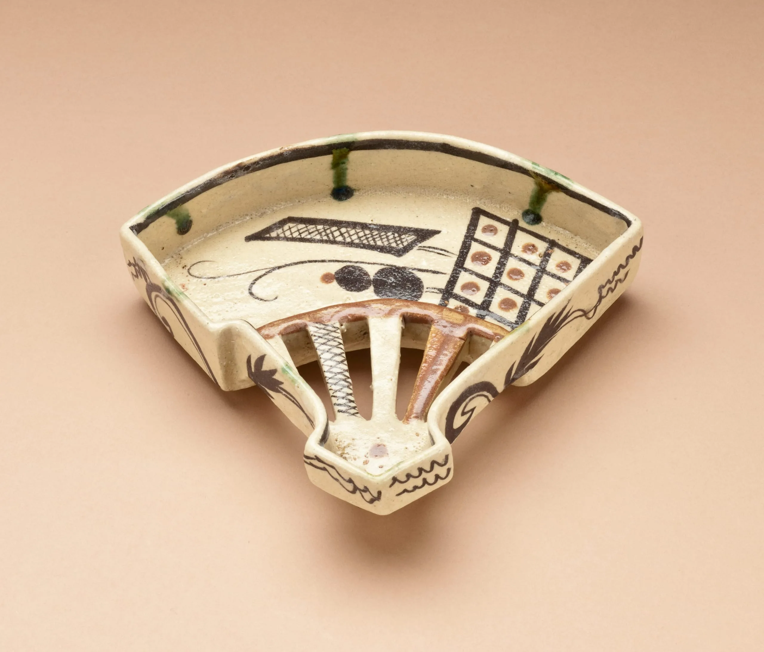 This set of five fan-shaped food vessels of Oribe Ware was made in the Momoyama period (1573-1615) for the meal served during the Tea Ceremony. Originally designed by the Tea Master Furuta Oribe (1544-1615), Oribe Ware is renowned for its original and playful forms, colors, and motifs. Together with Shino Ware, Oribe Ware is the most desirable decorated ware used for the Tea Ceremony. In typical Oribe style, these five vessels are decorated with a variety of unusual motifs: skewered dumplings, grilling nets, stylized plum flowers, grasses, and game boards.