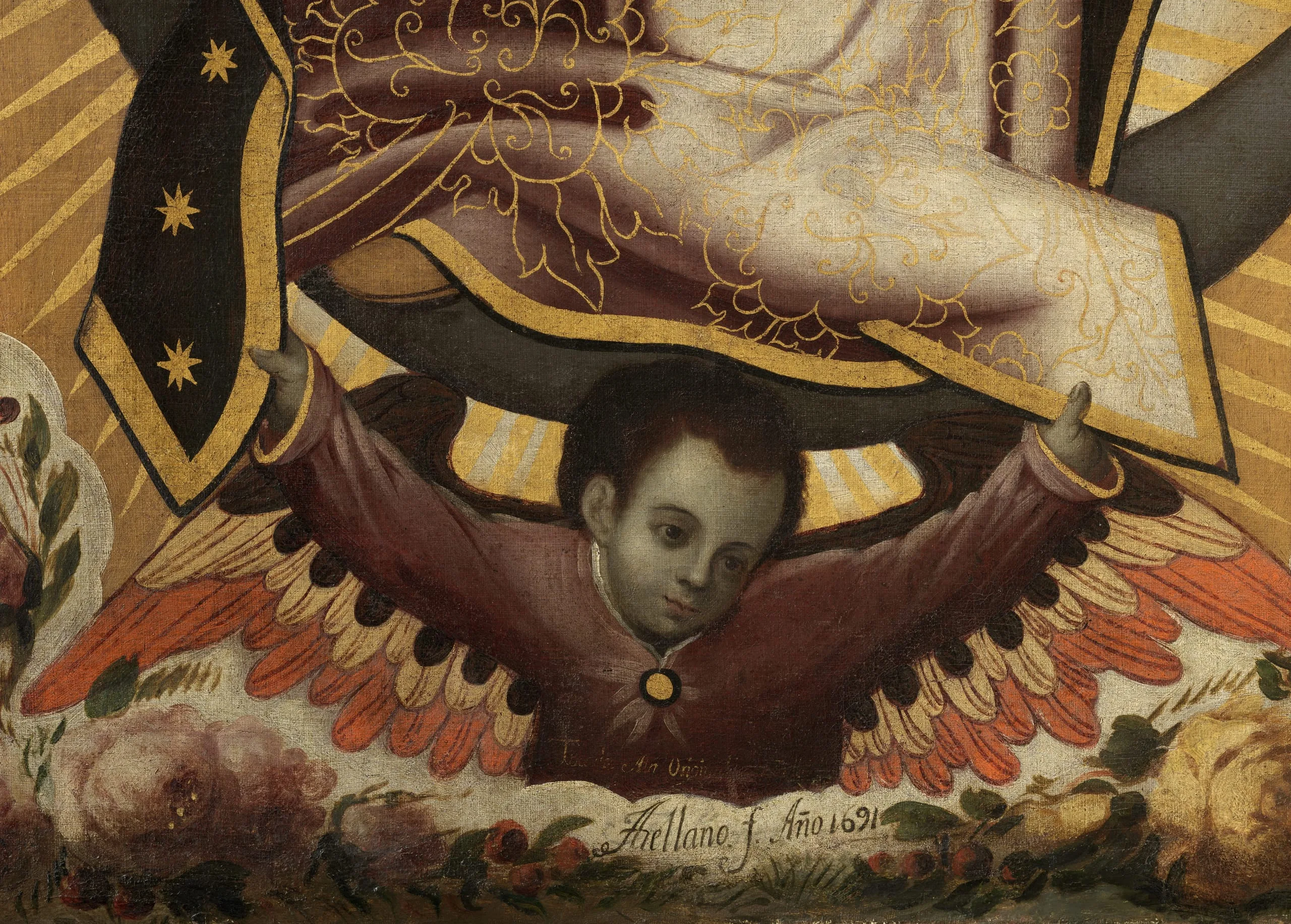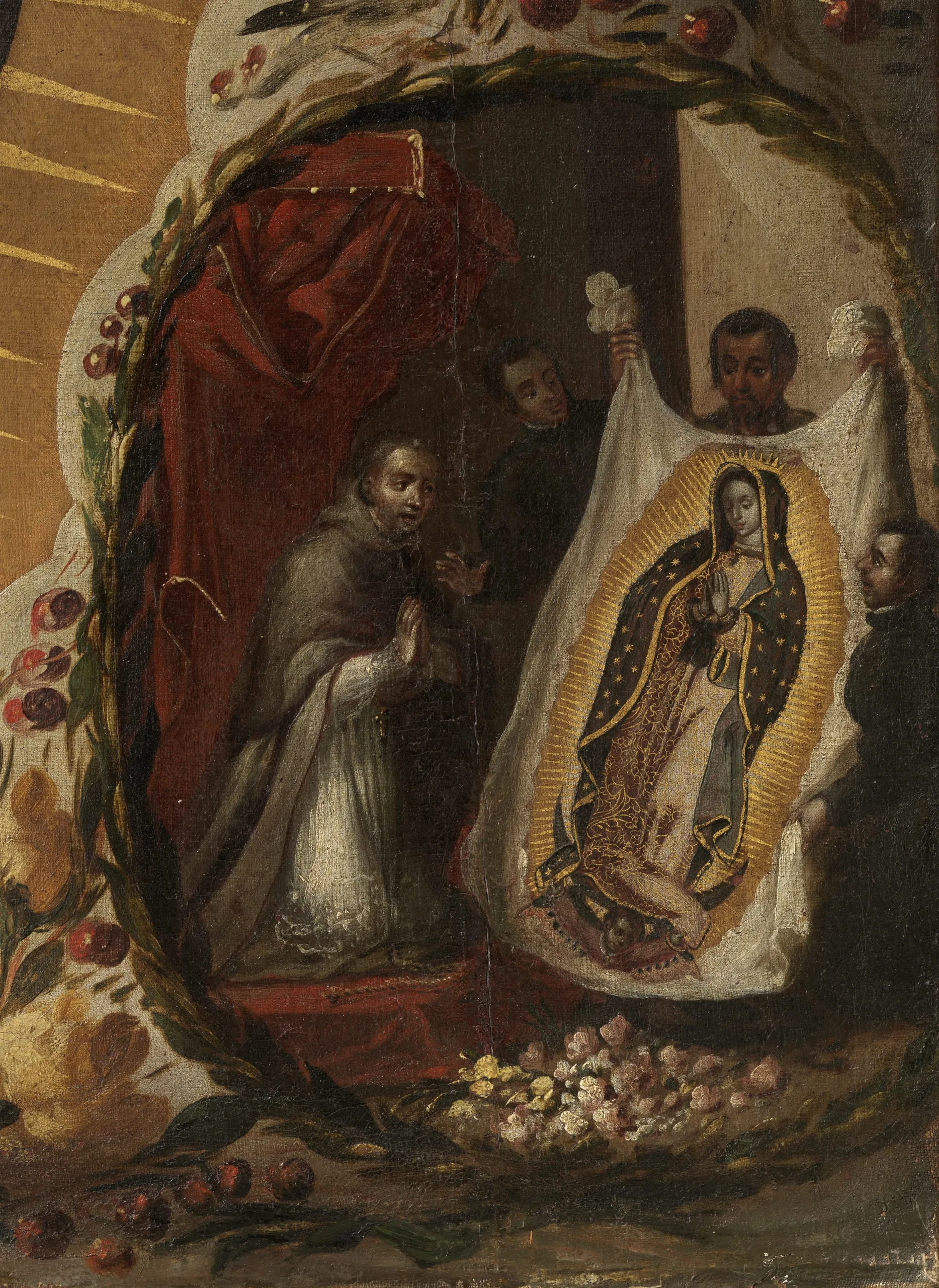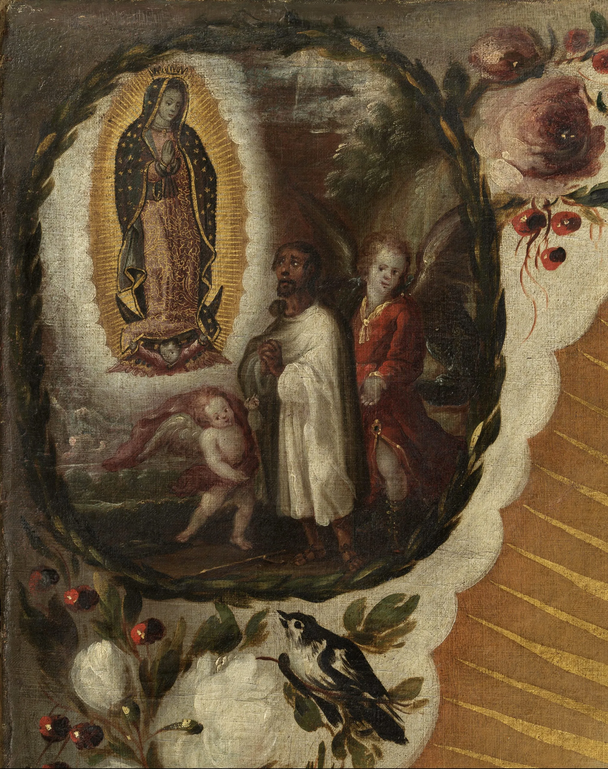 Our Lady of Guadalupe is one of the most reproduced images of the Christian world. This copy by Antonio and Manuel de Arellano depicts the Virgin surrounded by four vignettes, which narrate her appearances to the Indian Juan Diego in 1531 and the unveiling of her miraculous image imprinted on his cloak.