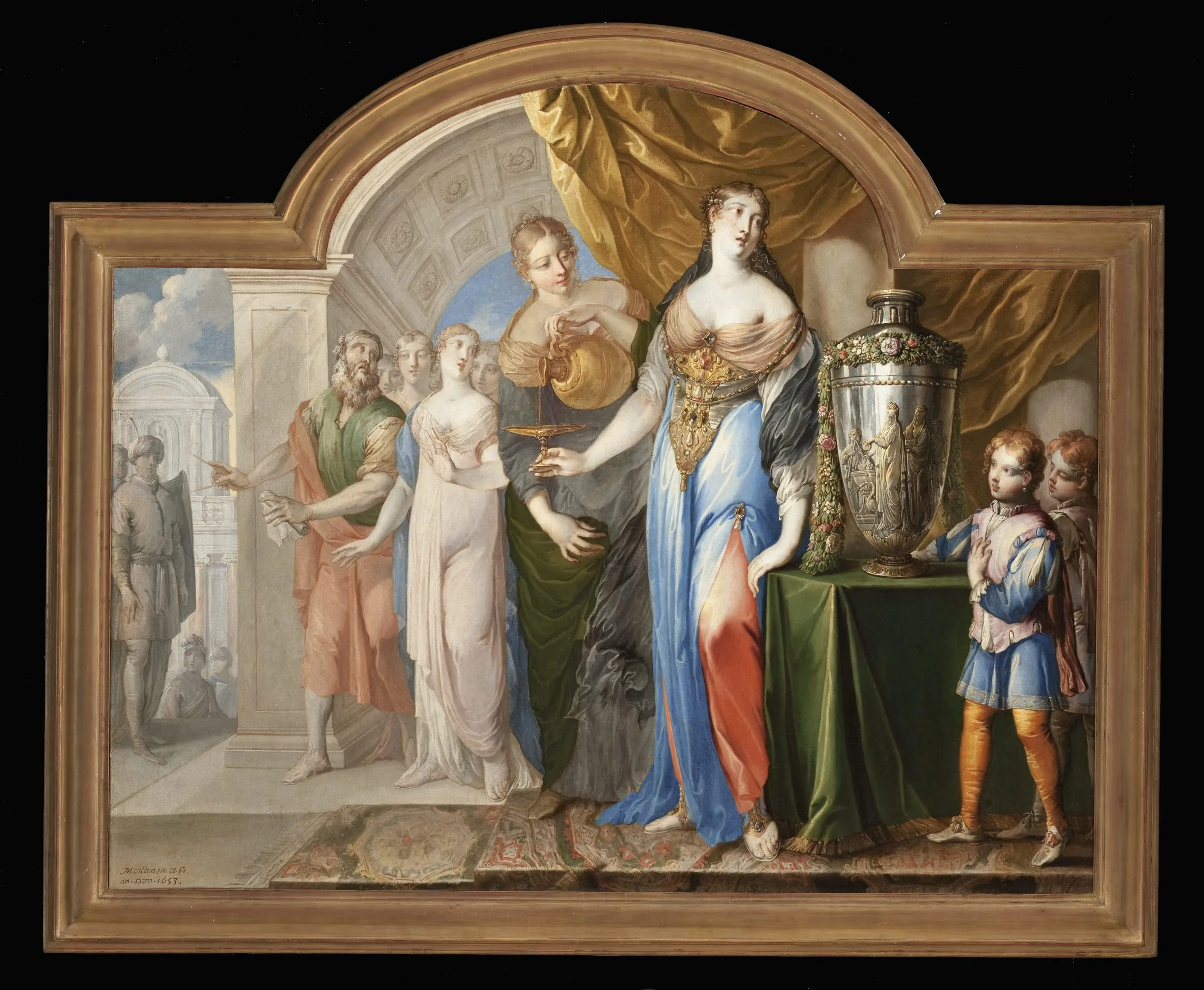 The reconstruction of his work began in the early 1980's (culminating in an exhibition and major catalogue in 2005) and has thus far yielded an original body of work whose existence challenges our established notion of classicism. While his paintings reveal subtle affinities with the works of some of his contemporaries, Laurent de la Hyre and Jacques Stella (artists represented in LACMA's collection) in particular, they are also striking for their originality and elegance. Particularly remarkable are the decorations done by Isaac Moillon in the early 1650's for various chateaus in the Auvergne. Sophonisbe Drinking Poison seems to belong to this group. The subject of Queen Sophonisba drinking poison rather than being paraded in the Roman triumph of her victor, Scipio Africanus, was much in favor in French literary circles at the time Moillon executed this painting. Plays by Jean Mairet (1634), Georges de Scudery and Pierre Corneille (1663) had made the theme popular with the public.
