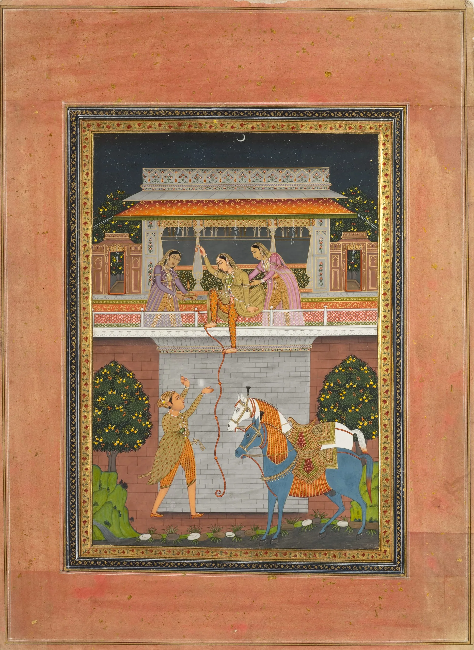 The subject of this folio from the Wellington Album is that of young lovers eloping, which was a favored subject in the primary repertoire of pictorial themes in the courtly painting of northern India. Aided by her two maidservants, the lovestruck lady daringly escapes the palace in the dead of night by climbing down a knotted rope to join her lover who waits with two swift steeds.