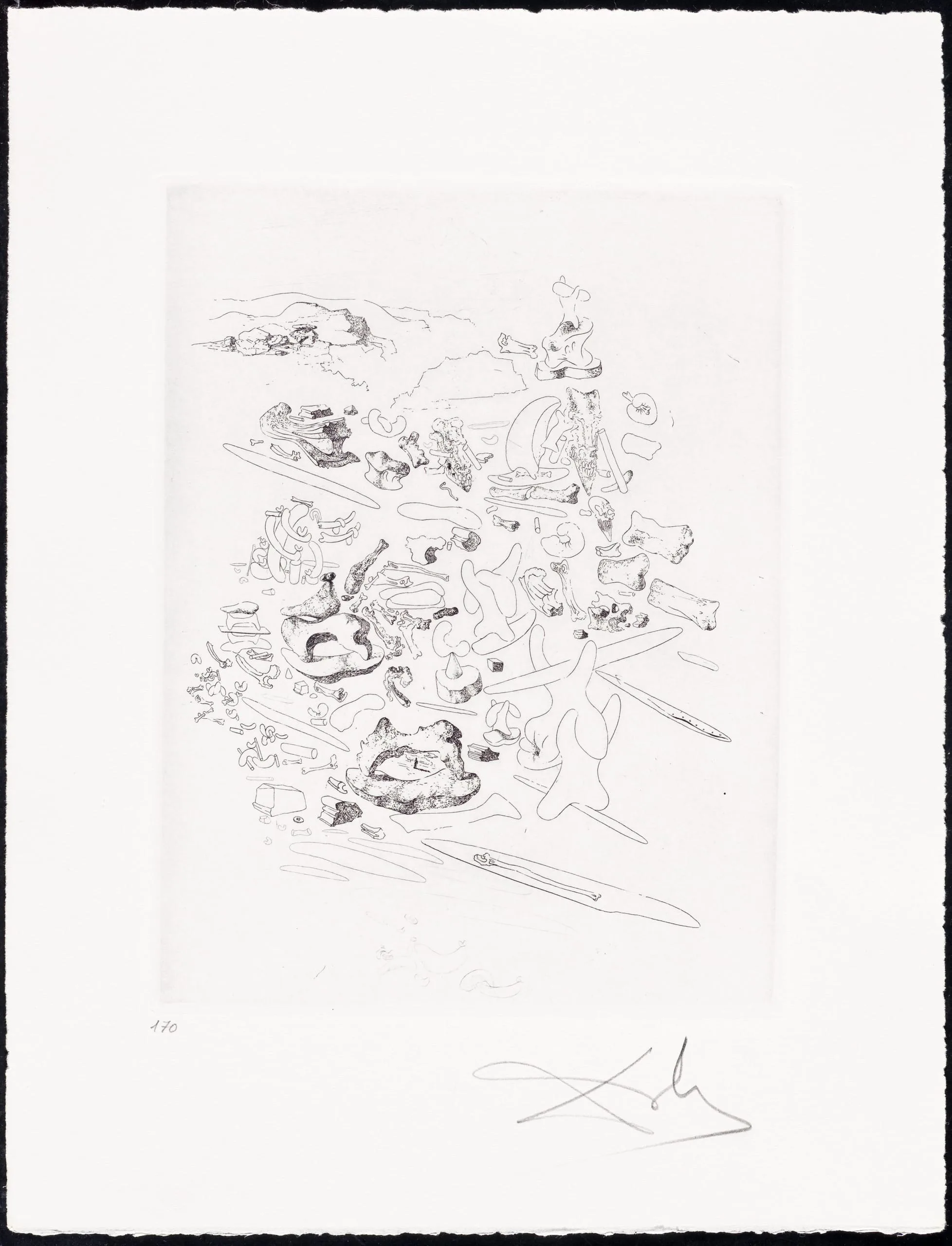 Etching on cream paper with scattered surreal biomorphic and skeletal forms, fine black lines, and a cursive signature in the lower right margin